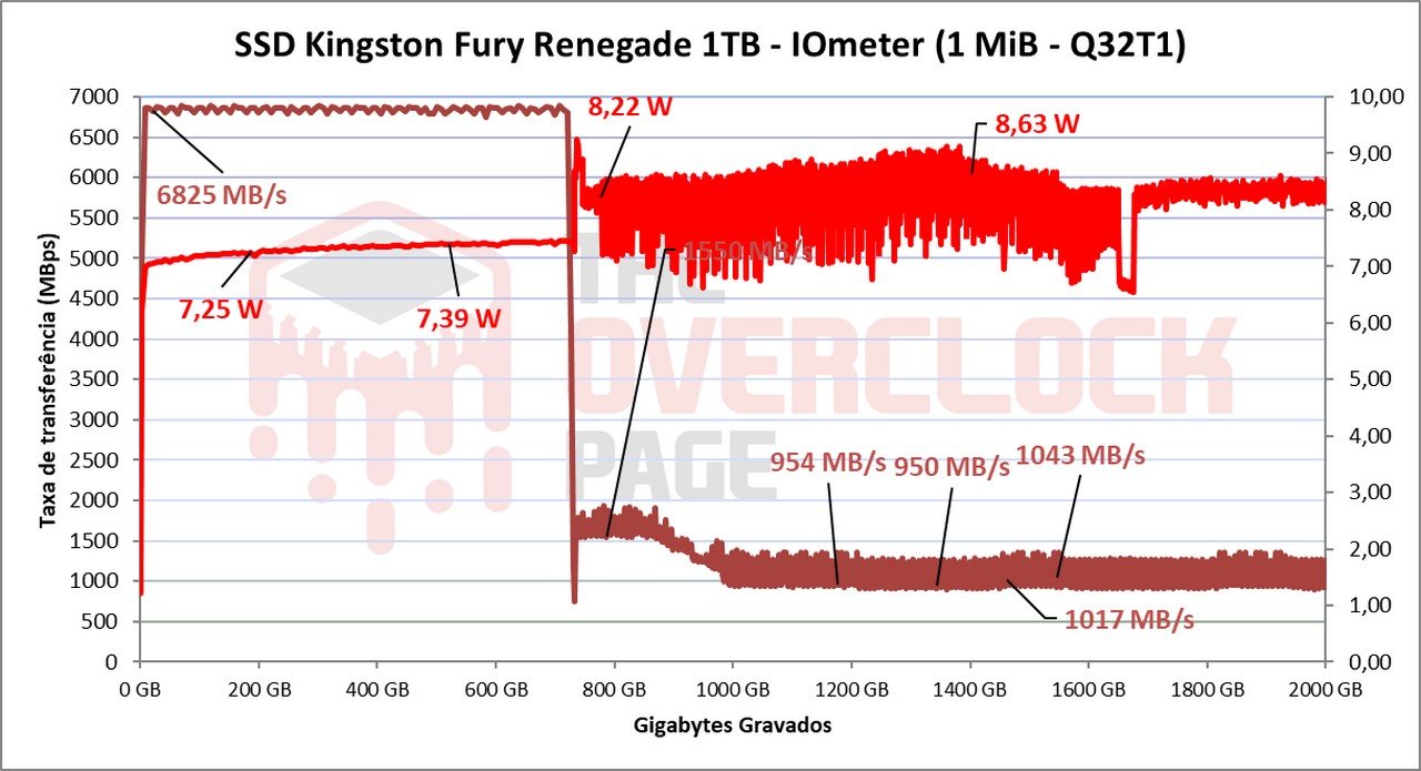 After writing 731GB, it starts to enter the folding process as it has allocated its entire capacity to work as pSLC. Therefore, we see here the scenario of the worst state of the SSD, where it went from 732GB to 2TB, writing at an average speed of 1038 MB/s.