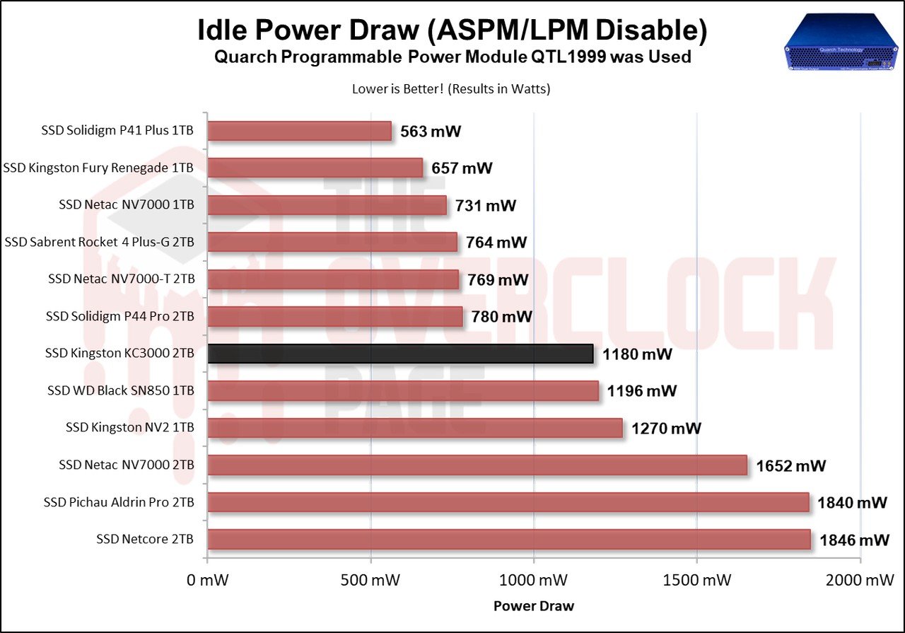 Lastly, and most importantly, the Idle test, which represents the scenario where the vast majority of SSDs are during daily or routine use. Interestingly, it was observed that the KC3000 had a higher consumption than expected, with an Idle power consumption of almost 1.2W, while the Fury Renegade had a consumption almost half that of the KC3000.