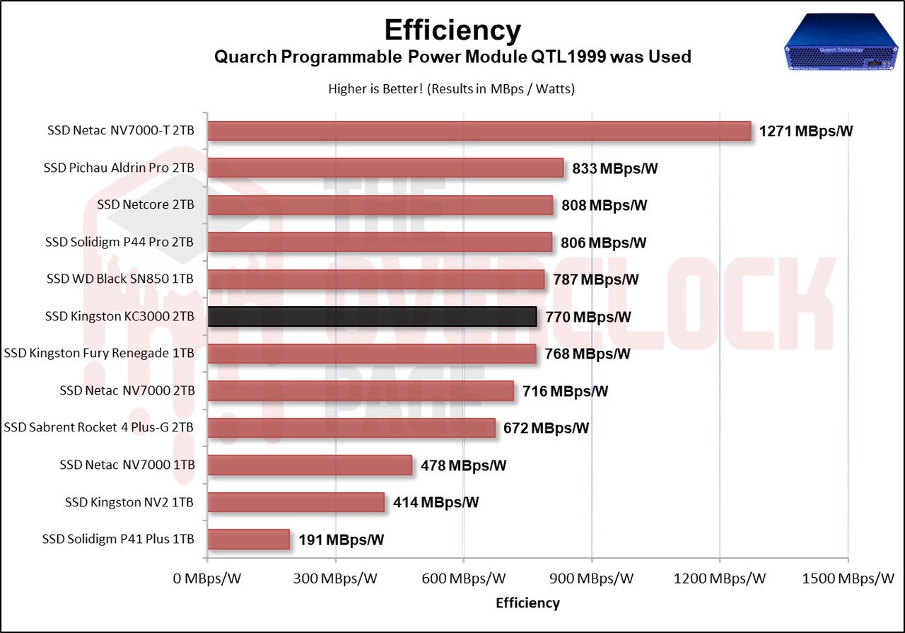 The SSD showed an “OK” efficiency, not reaching the highest in the comparison. Although its bandwidth was quite high, its power consumption was also elevated, which slightly reduces its overall score.