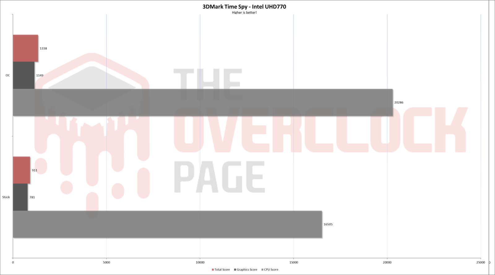 In 3DMark Time Spy, the UHD770 at stock settings showed a GPU Score remarkably similar to that of a Vega 6 with DDR4-3200, which is the integrated graphics used in APUs like Ryzen 5 5350G and Ryzen 3 5300U. However, with overclocking, there was an increase of just over 47%, which is a significant improvement.