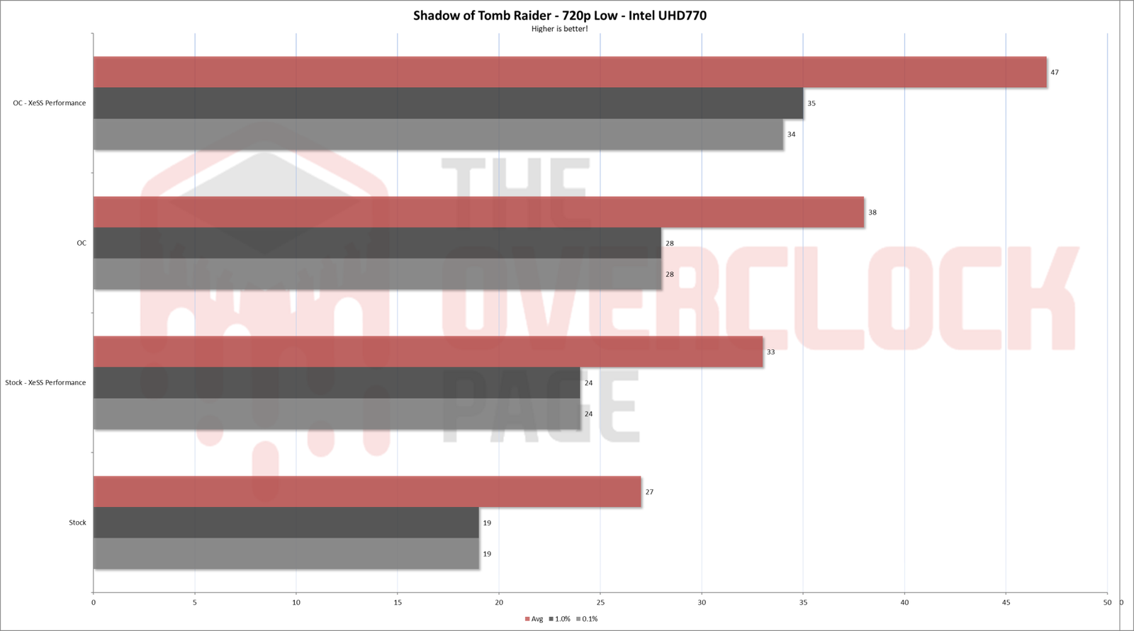 - For Shadow of the Tomb Raider (SOTTR), the included benchmark tool was utilized at 720p/1080p with the “Low” preset, TAA, and XeSS set to “Performance” when activated.