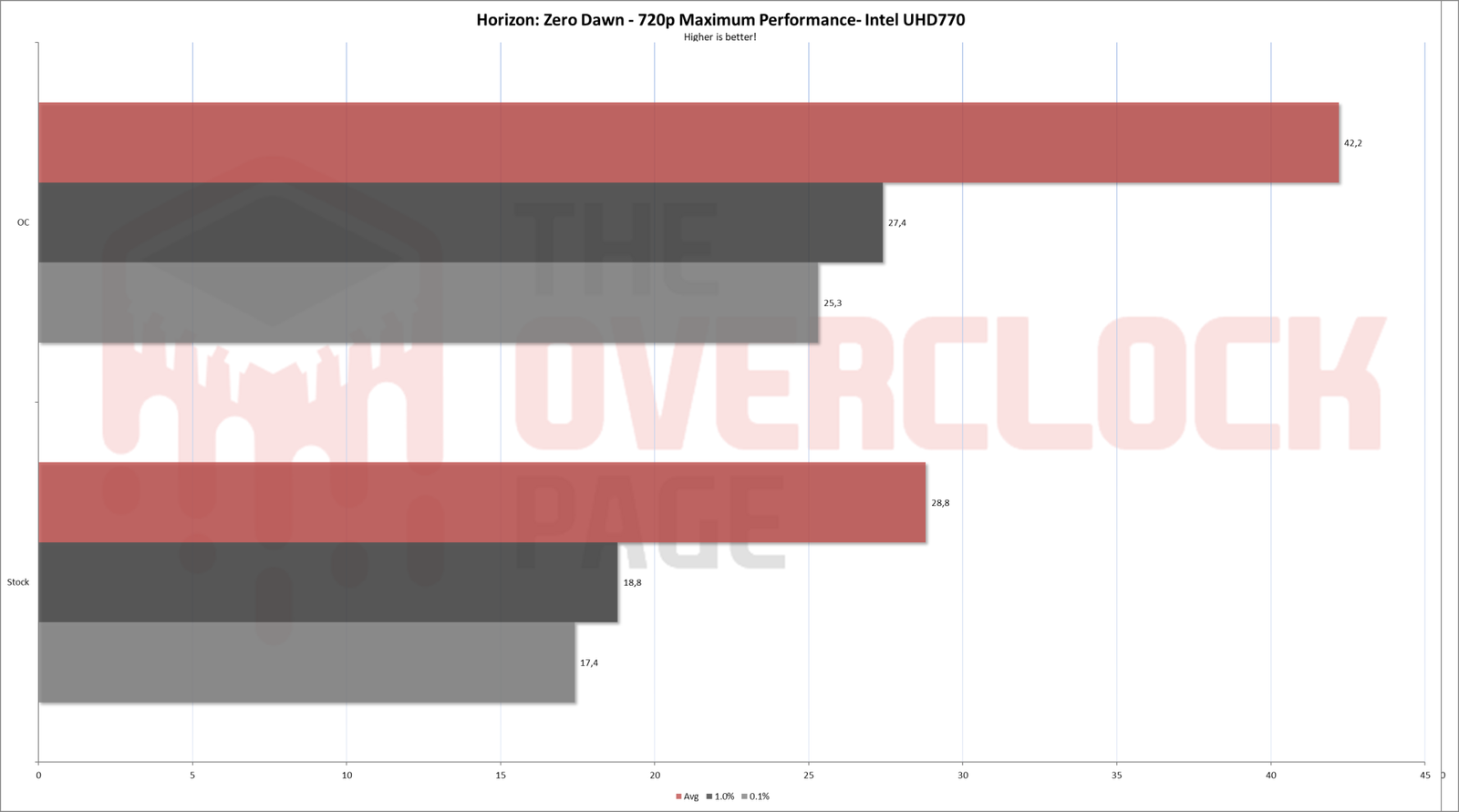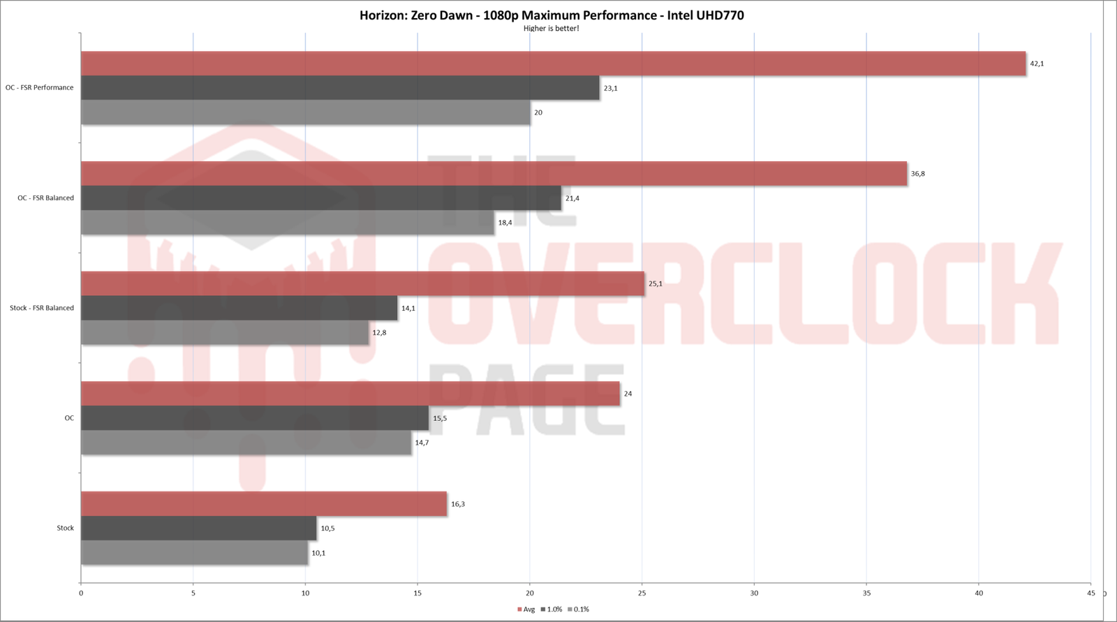 As expected, at 1080p, things didn’t fare too well for the UHD770, even with overclocking and FSR/XeSS, experiencing challenges in all three games. It’s interesting to note that FSR in “Performance” mode eked out a bit more performance, with gains ranging from 8 to 14% compared to “Balanced” in Zero Dawn.