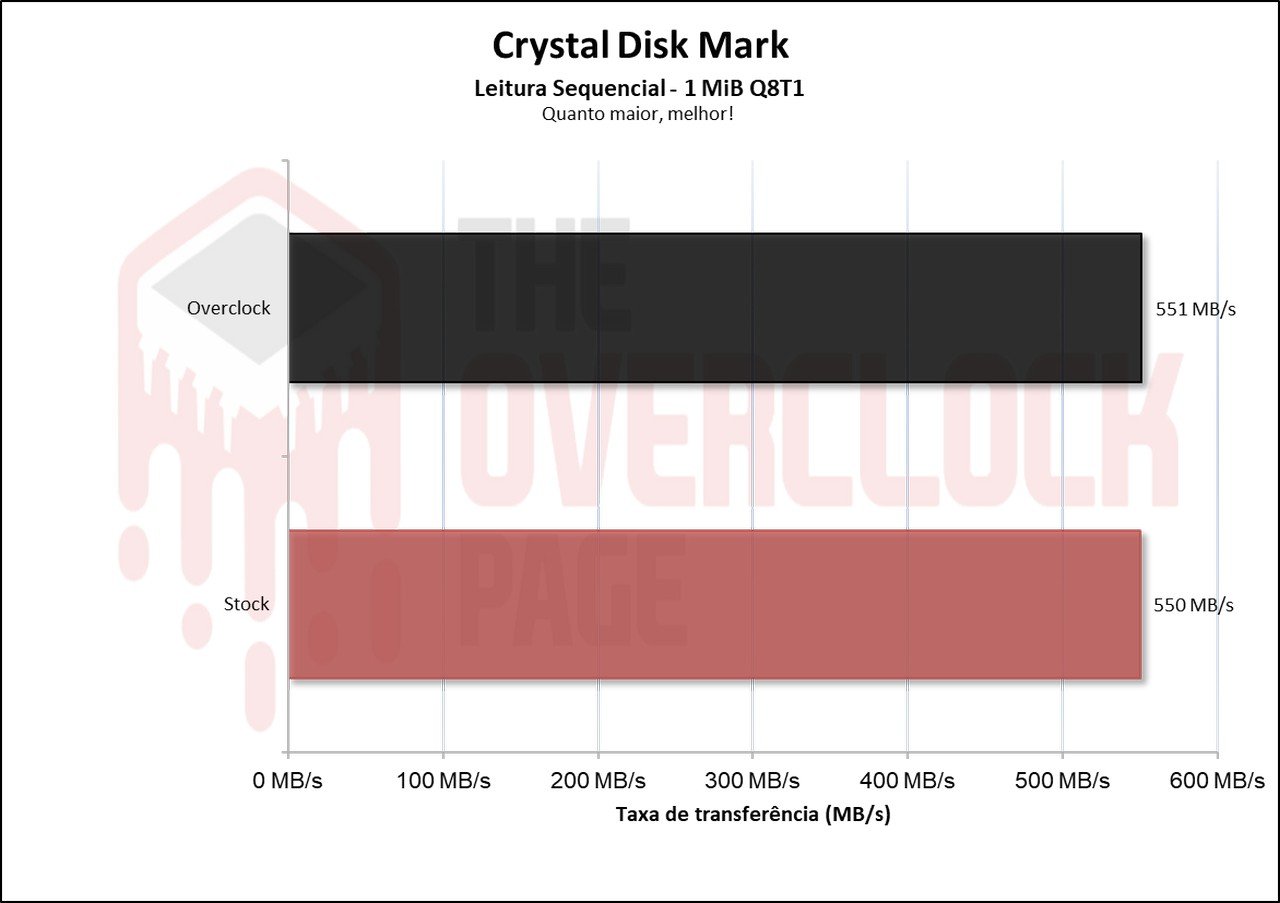 No cenário de leitura e escrita sequencial, não houve uma diferença, pois o SSD já estava limitado pelo barramento SATA quando utiliza a técnica de SLC Cache, portanto, aqui não esperava ver alguma diferença notavel.