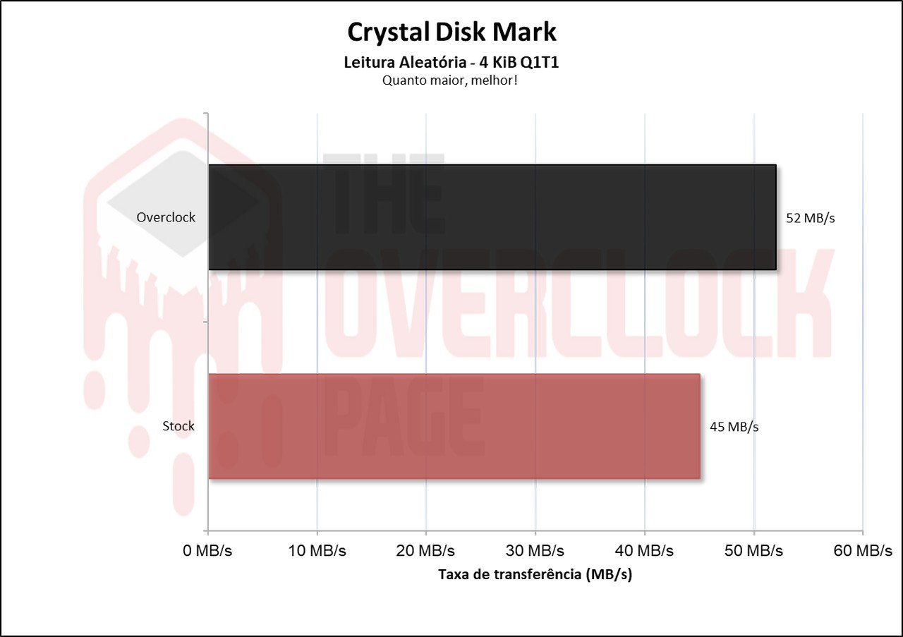 Já em suas latências, houve uma queda pequena quando fizemos o overclock, o que foi um ponto interessante.