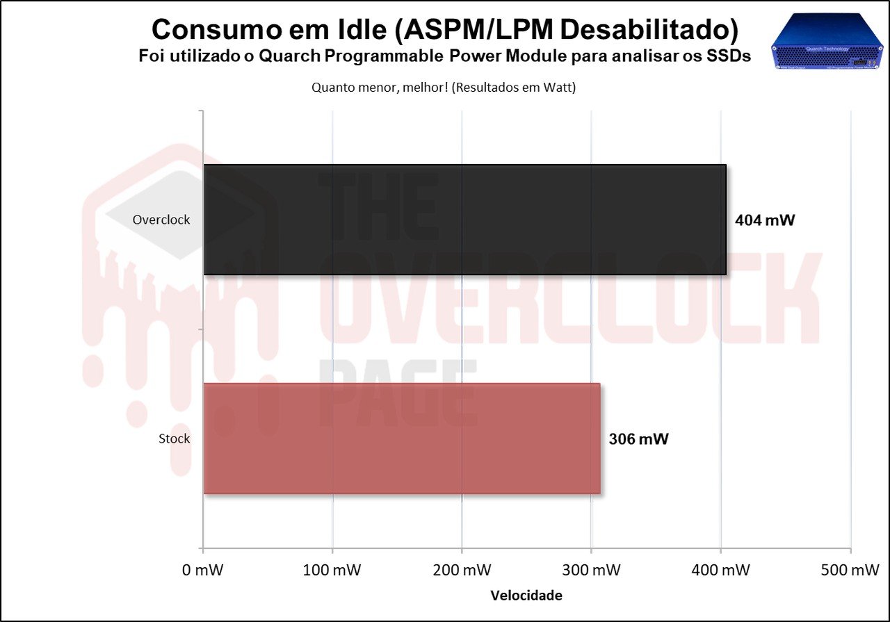 Vemos que ao aplica este overclocking seu consumo quase que dobrou, então foi algo bem interessante de se ver, mas que penaliza muito a eficiência e por esse motivo além dos mencionados anteriormente a fabricante deve ter configurado o SSD com frequências menores.
