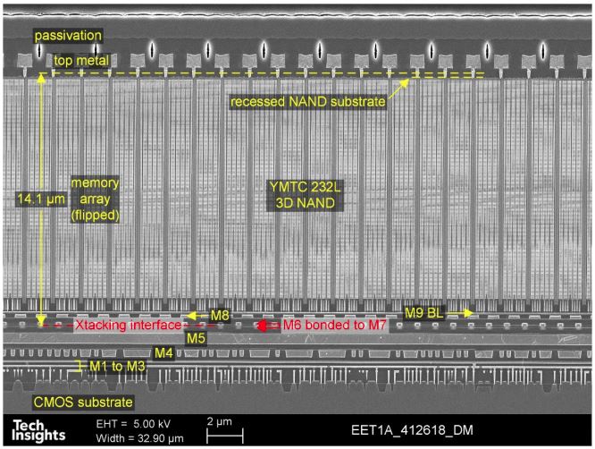 In terms of its storage integrated circuits, the 2TB SSD features 2 NAND flash chips from the Chinese manufacturer YMTC, model YMC6G008Tb78CA1C3. These are 1Tb dies (128GB) containing 232 layers of data and a total of 253 gates, resulting in an array efficiency of 91.7%. Of the 253 layers in the SSD, 232 are allocated for storage, generating this efficiency.