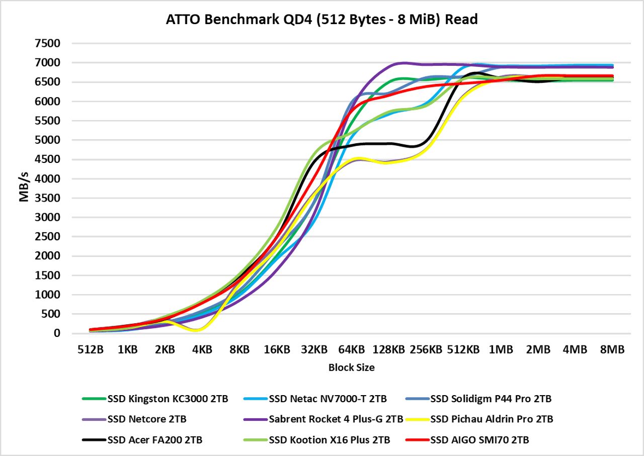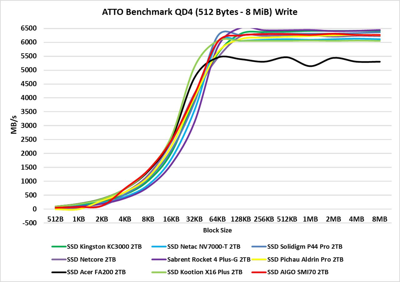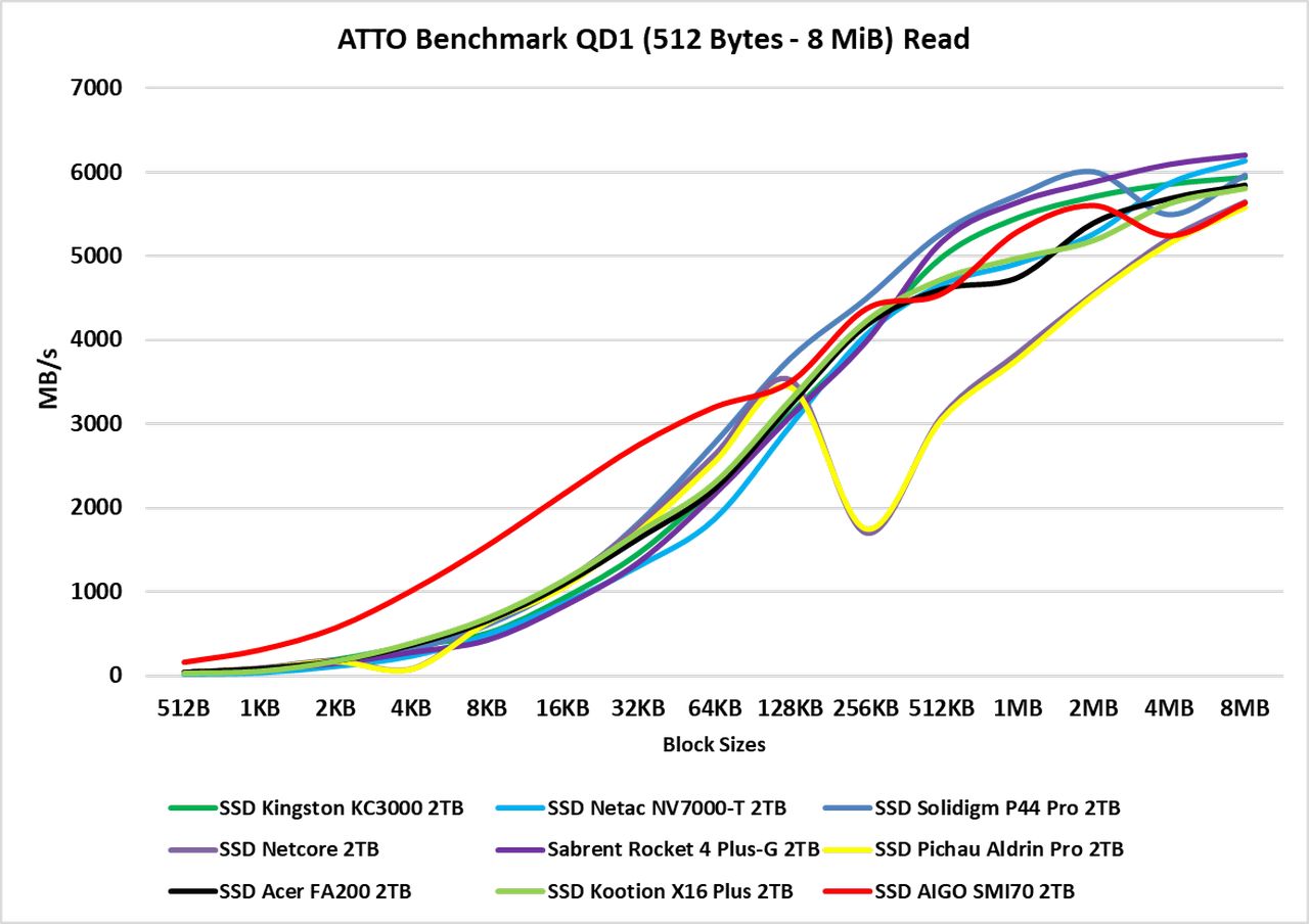 The ATTO Disk Benchmark is a software that performs a sequential speed test with compressed files, simulating data transfer loads as in Windows. Typically, we observe block sizes ranging from 128KB to 1 MiB. Now, we can see that both in reading and writing, the SSD performs well compared to the other SSDs in the comparison.