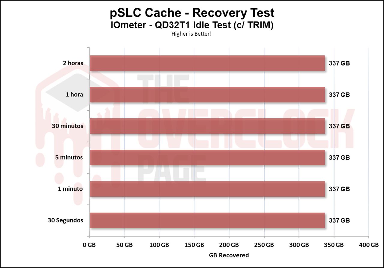 We also conducted a test to see how long the SSD would take to recover part of its buffer, during our test battery, which lasts from 30 seconds to 2 hours in idle, using TRIM and garbage collection versus not using TRIM/GC. When testing without using TRIM/GC, we observed that it failed to recover any of its SLC cache, which is a downside indeed. However, this doesn’t necessarily qualify it as having poor SLC cache design; it simply means that in this unrealistic scenario, it couldn’t take advantage of this opportunity.
