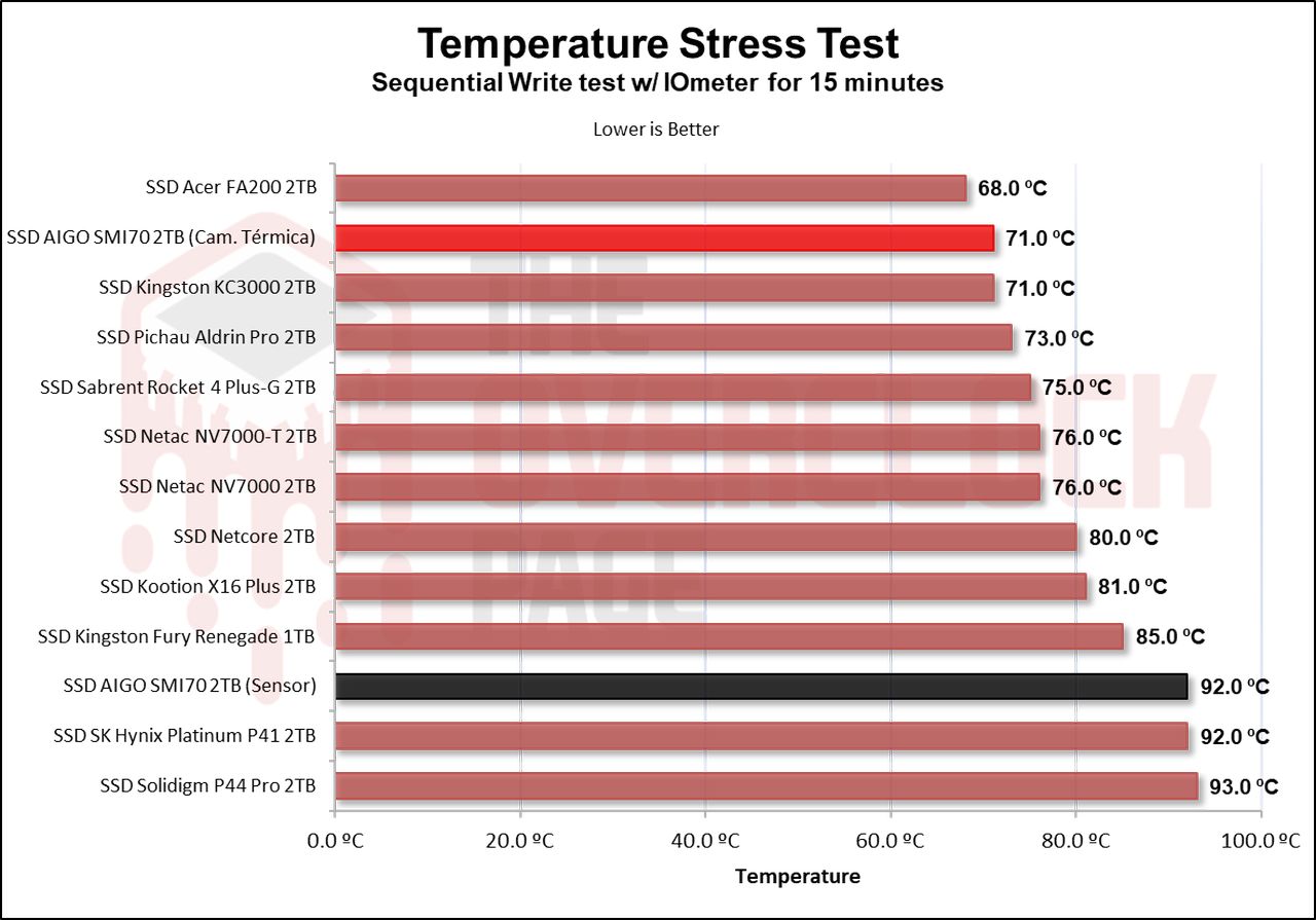 As seen above, this SSD has a default thermal throttling limit of 86ºC to 93°C, which is a decent value. Through the sensors, we observe that it exceeds 92ºC, causing the controller to enter one of the Thermal Throttling states where its speeds drop from 3000 MB/s to around 1400-1500 MB/s.