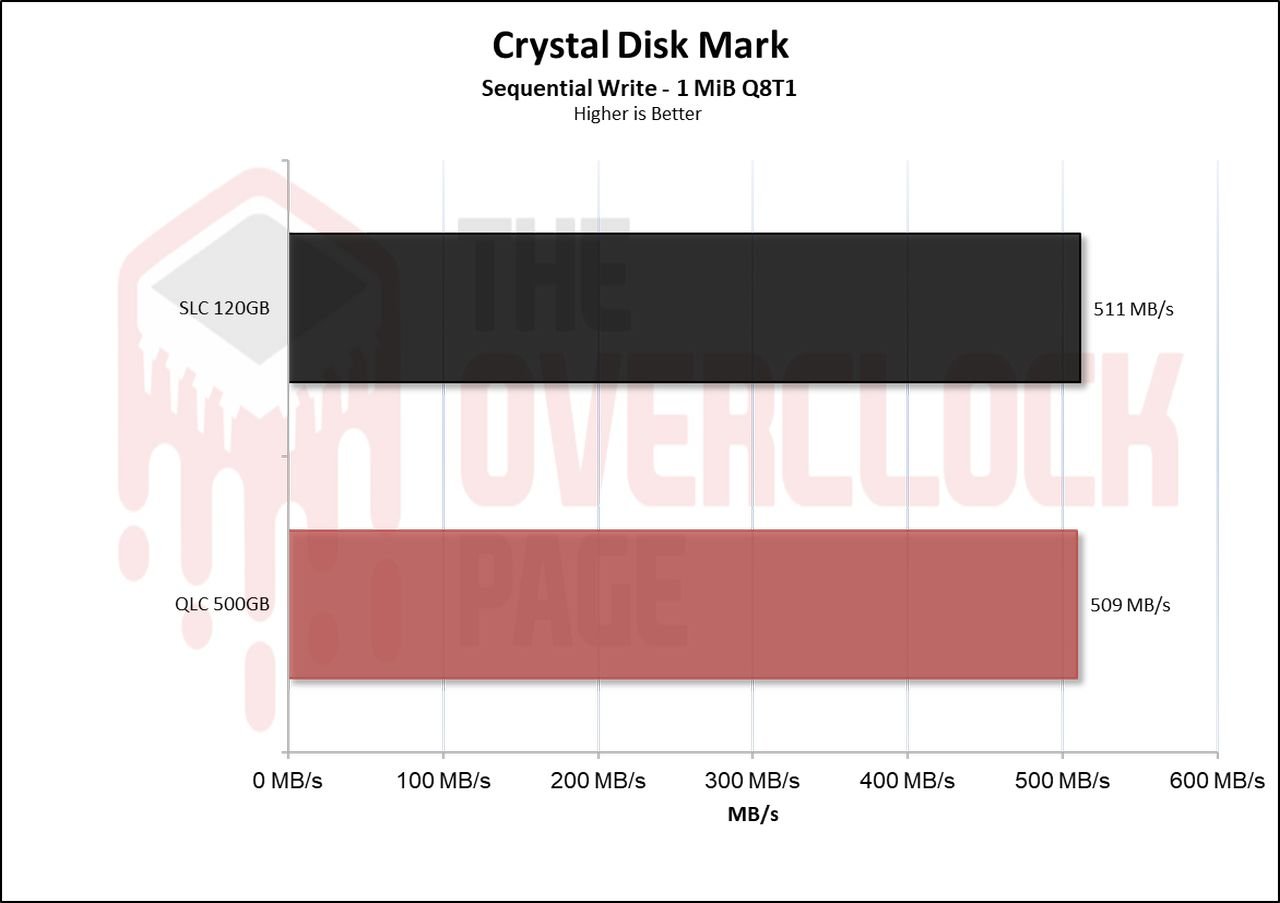 Now, when we transform this SSD into pSLC, we see that it writes to its full capacity of 120GB at an average of 498 MB/s. And to confirm, we wrote up to 500GB to the SSD, and even then, it continued rewriting its capacity more than 4 times at almost 500 MB/s.