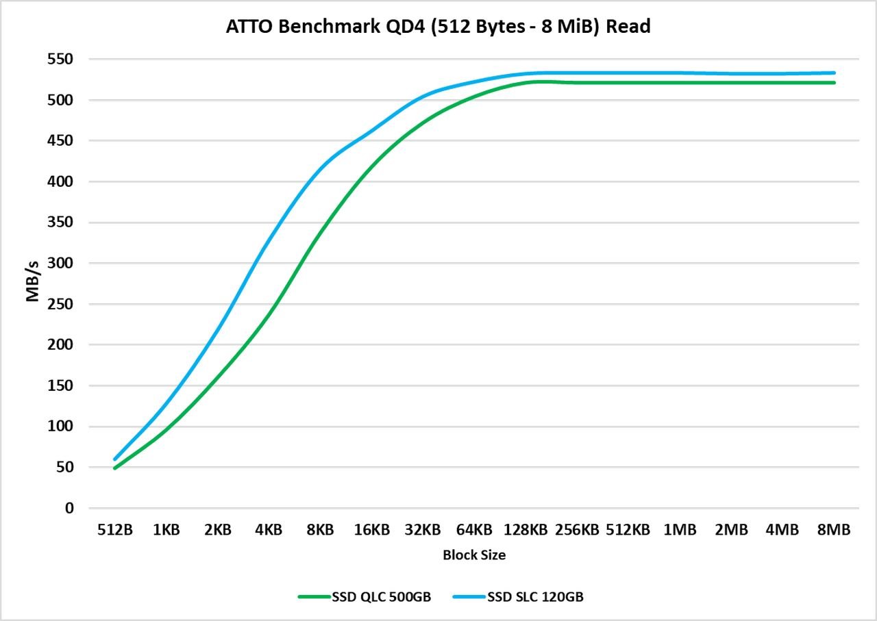 The same pattern repeated at queue depth 1, although the difference in some block sizes was slightly lower compared to a queue depth of 4.