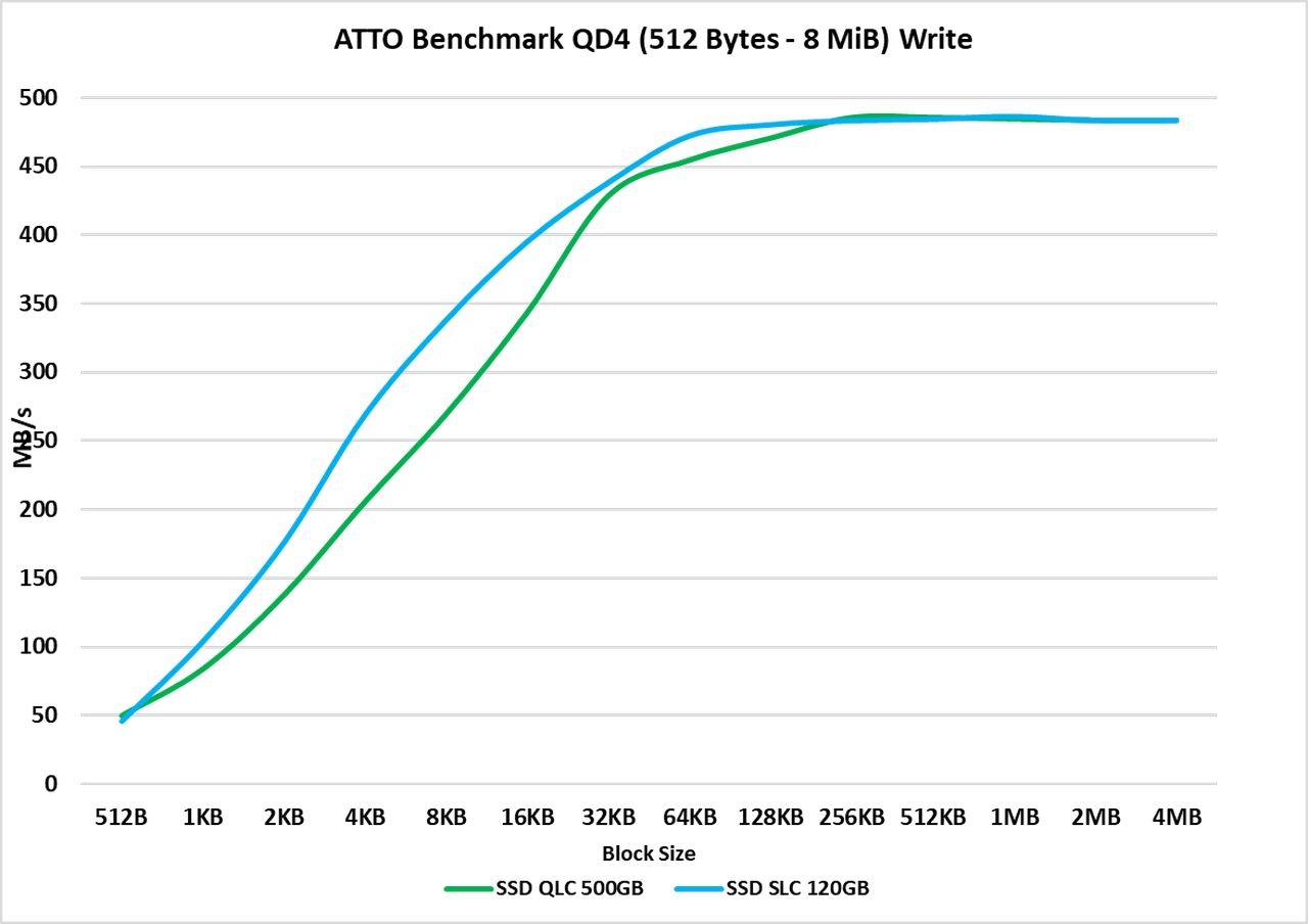 The ATTO Disk Benchmark is a software that performs a sequential speed test with compressed files. Therefore, for a simulation under a data transfer load like in Windows, we typically see block sizes ranging from 128KB to 1MB. Now, we observe that the SSD in pSLC mode outperforms the SSD in its factory mode across all block sizes, which is impressive once again.