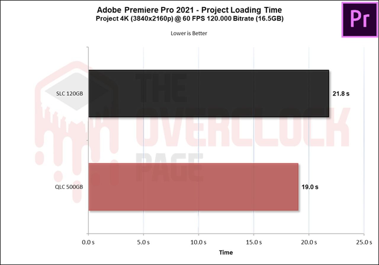 Next, we used Adobe Premiere to measure the average time it takes to open a project of about 16.5GB with 4K resolution, 120Mbps bitrate, and full of effects until it was ready for editing. It’s worth noting that the tested SSD is always used as a secondary drive without the operating system installed, as this could affect the results, leading to inconsistencies.