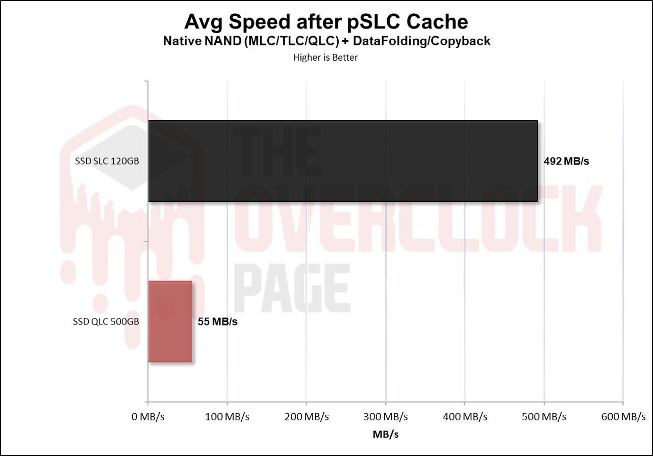 As we can see in the graph above, we averaged the SSD’s write speed, combining the speed within the pSLC Cache + Folding + Native. Taking this into account, we see that the difference was striking, almost 10 times higher.