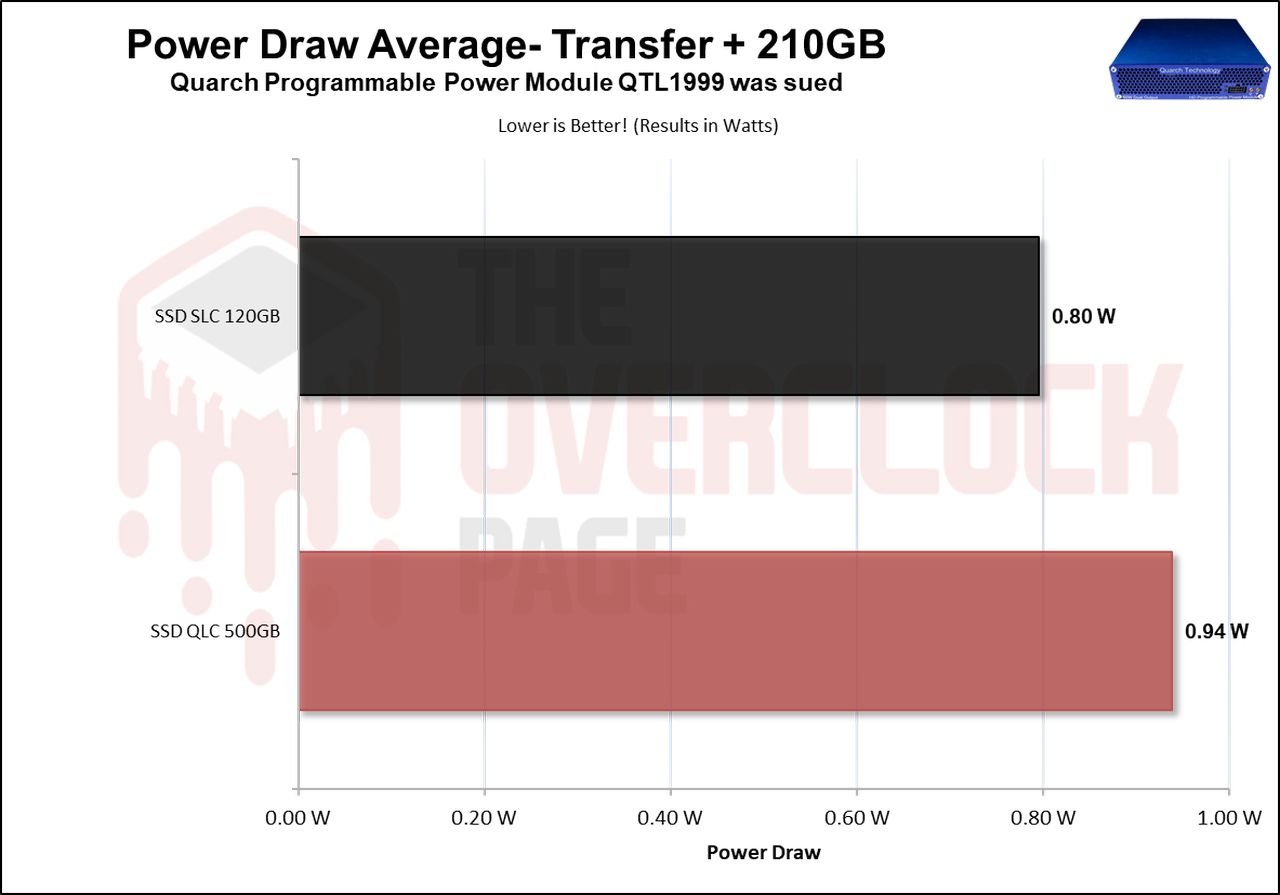 Due to the benchmark exceeding the SSD’s 45GB cache by a large margin, it spent a significant portion of the test at a very low speed of less than 55 MB/s, resulting in low efficiency. In pSLC mode, it was able to write twice its capacity at even lower power consumption than in QLC mode, and its bandwidth did not drop at any point. This led to the significant difference in power consumption.