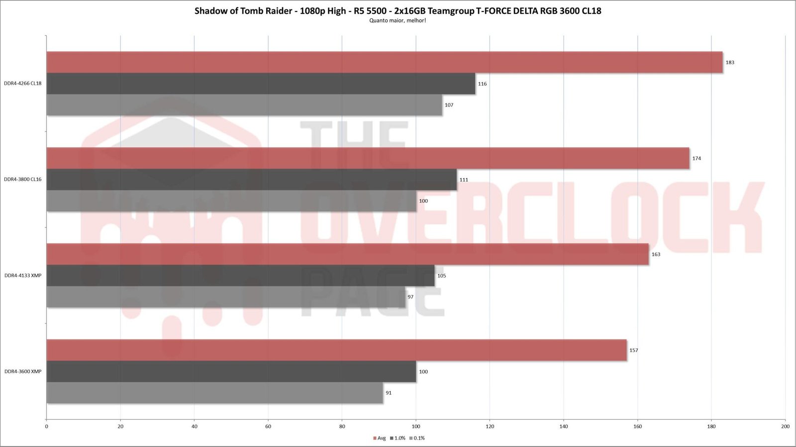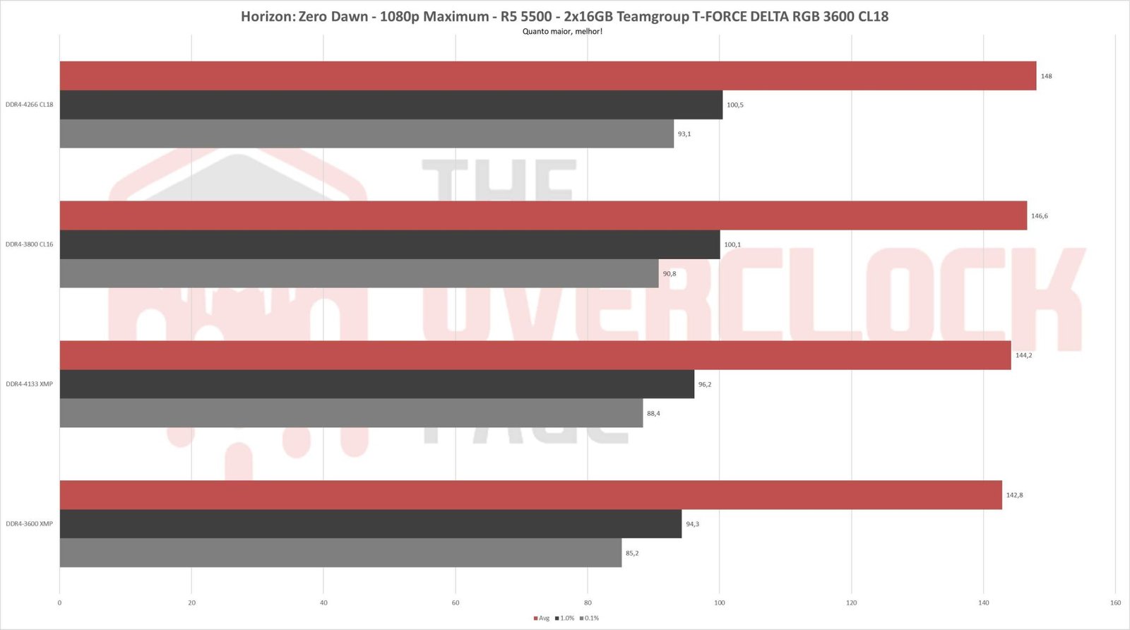 1) XMP: Trata-se do máximo possível de se obter apenas carregando o perfil XMP e subindo clock/tensão, parando no limite para o exemplar de Ryzen 5 5500 utilizado, claro, isso se a memória que estiver sendo testada conseguir chegar lá.