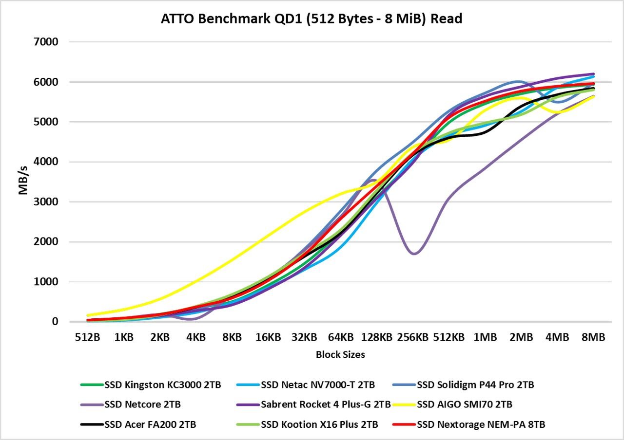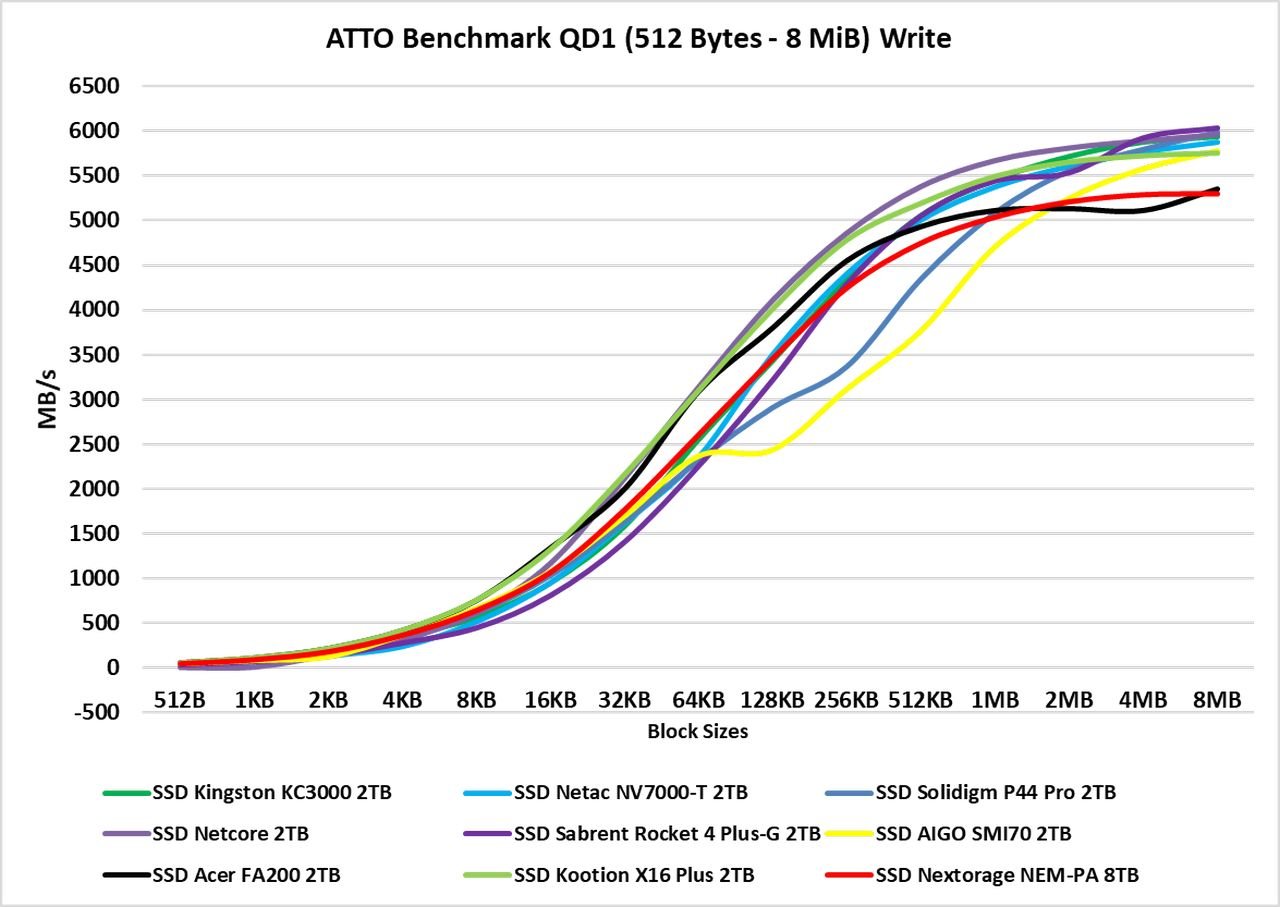 We conducted a test using ATTO to observe the SSDs’ speed across different block sizes. In this benchmark, it was configured as follows:
