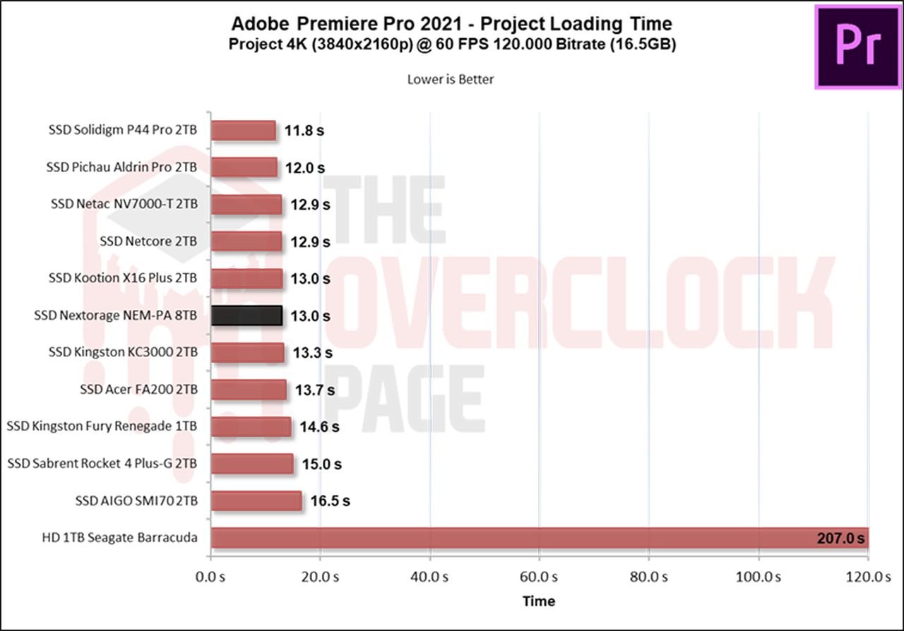 Next, we used Adobe Premiere to measure the average time it takes to open a project of around 16.5GB with 4K resolution, 120Mbps bitrate, and filled with effects until it was ready for editing. It’s worth noting that the tested SSD is always used as a secondary drive without the operating system installed, as this could affect the result, causing inconsistencies.