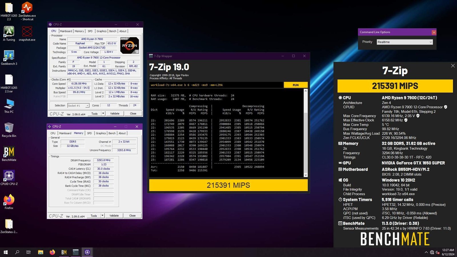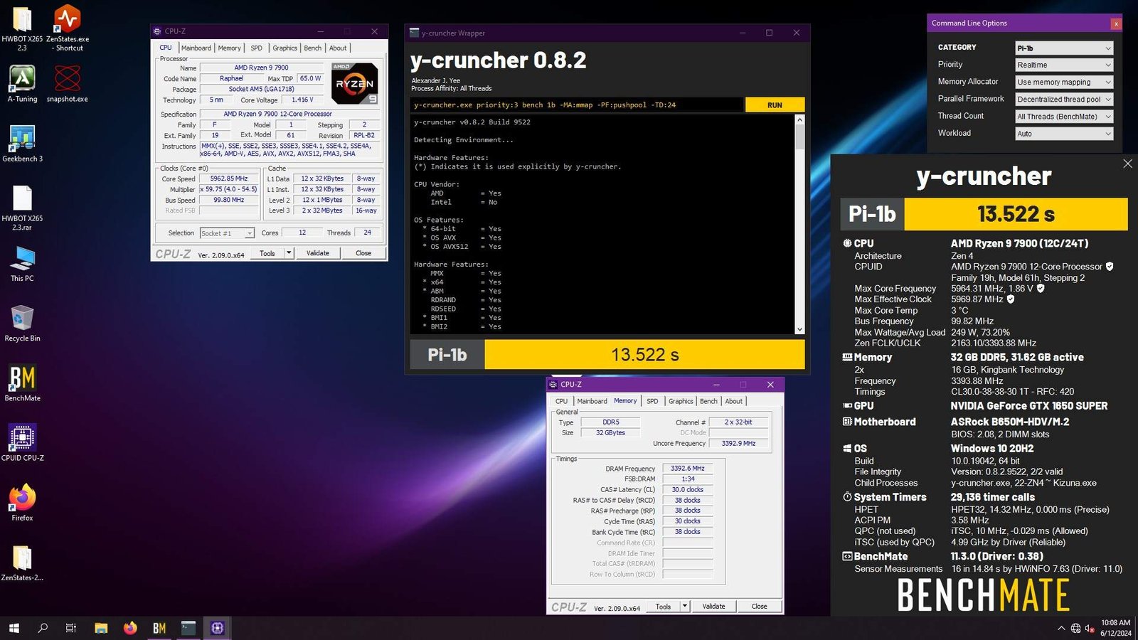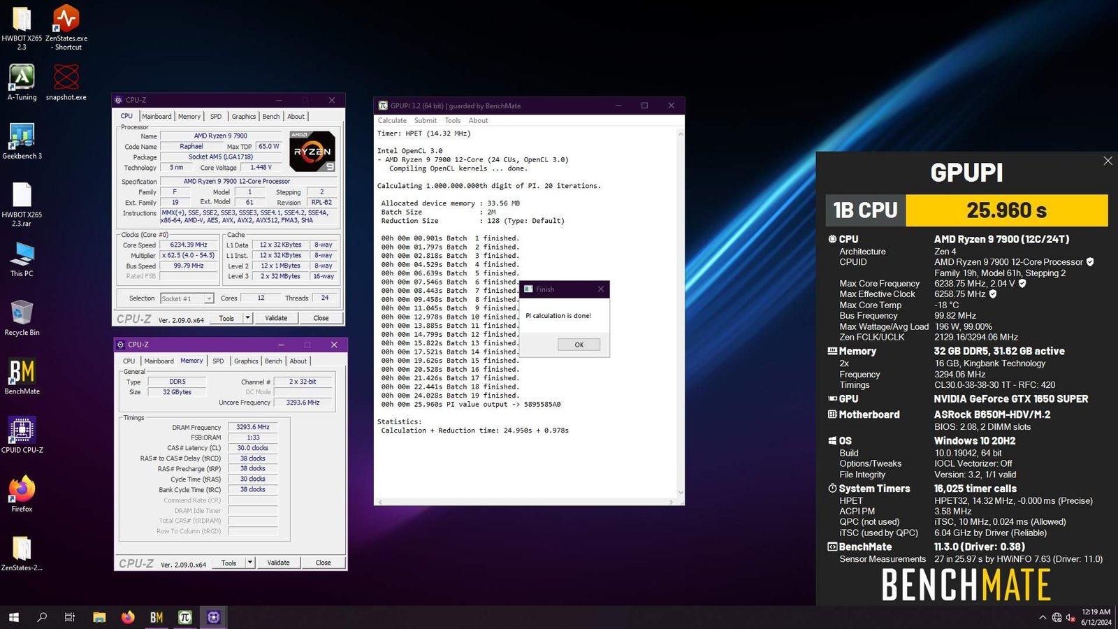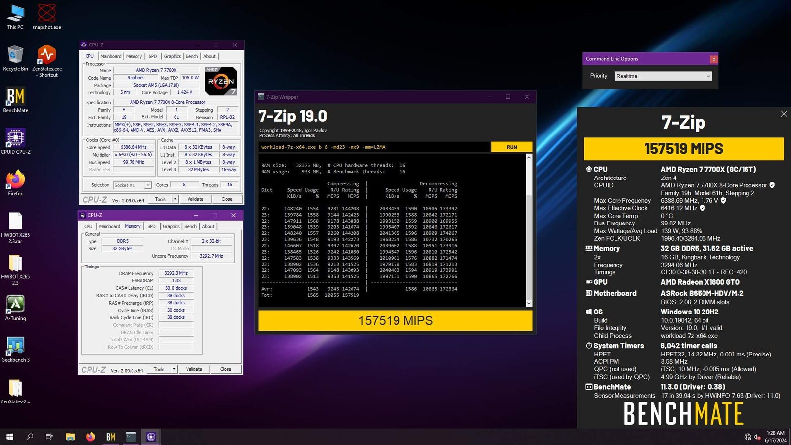Dito isso, ainda foi possível obter alguns excelentes resultados para esse processador, por exemplo, o cobiçado terceiro lugar global no GPUPI 1B na categoria 8x cores, com a CPU trabalhando a 6.5 GHz e um quinto lugar na categoria do Ryzen 7 7700X no 7-Zip, com a CPU em 6.4 GHz, ambos com tensão na casa de 1.45V.