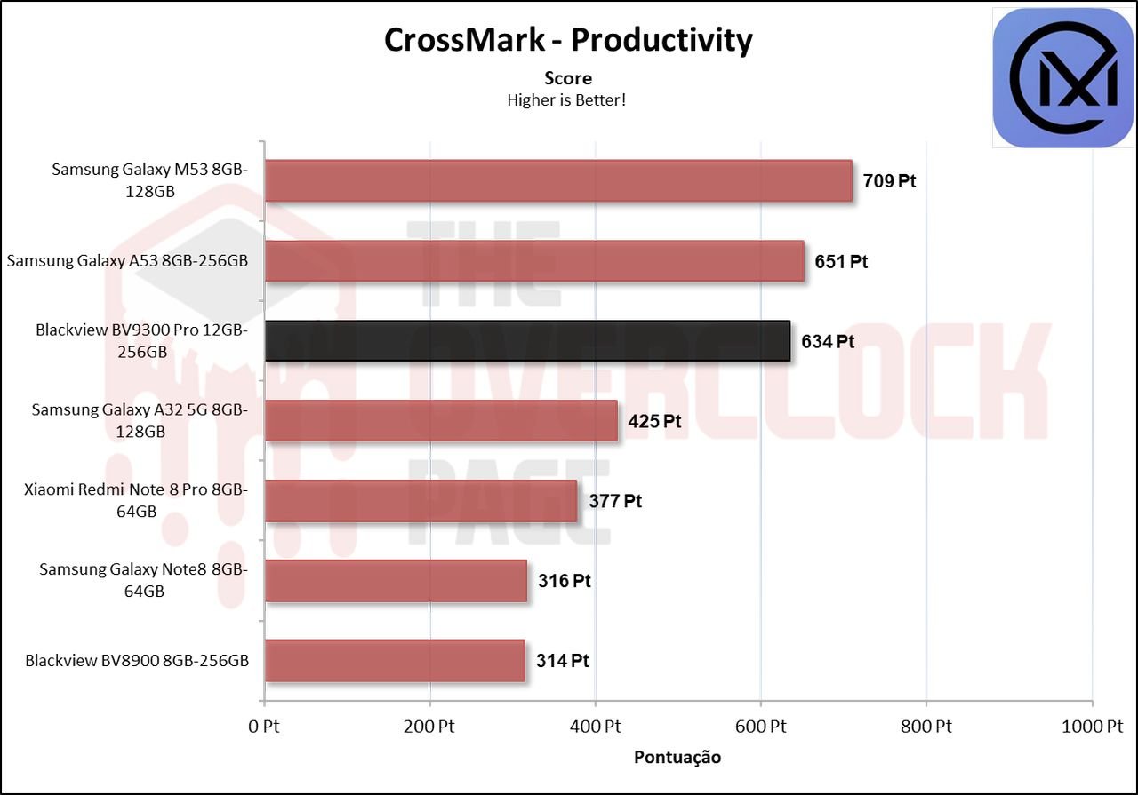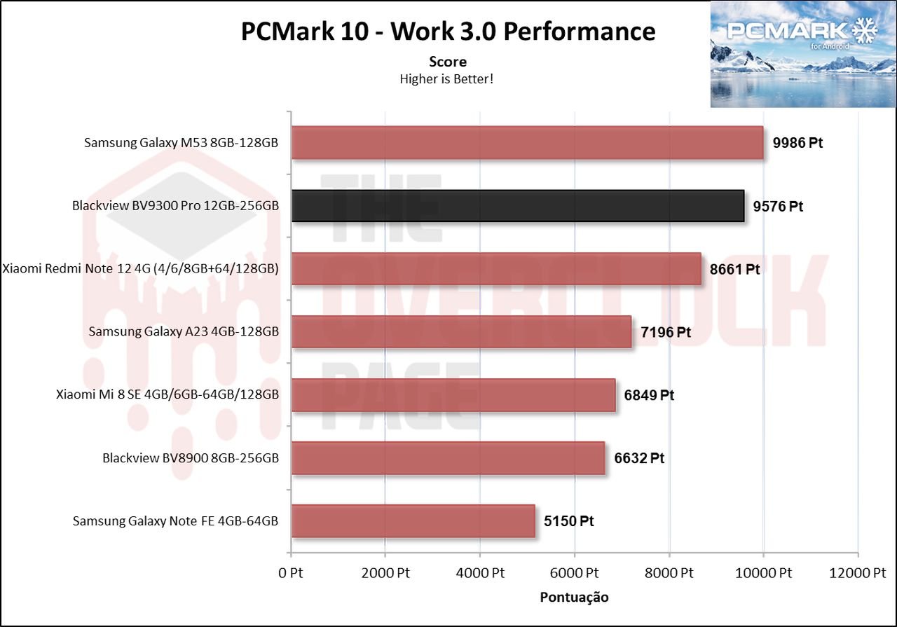 Neste benchmark de produtividade, o Blackview BV9300 Pro dispara na frente do seu antecessor com um resultado mais de 40% superior em relação ao BV8900.