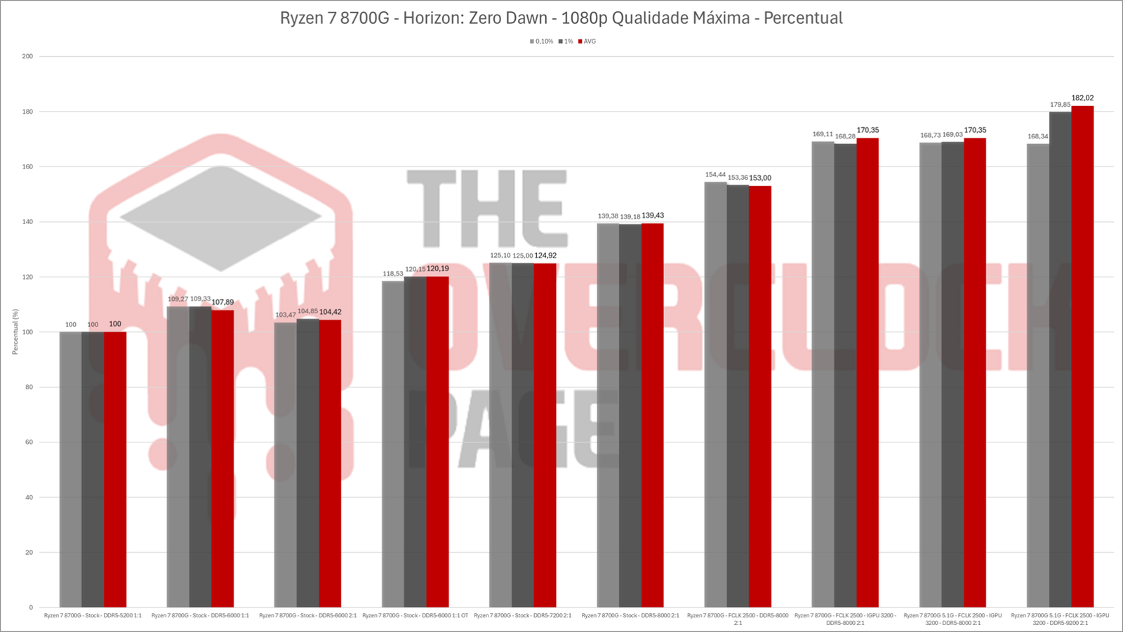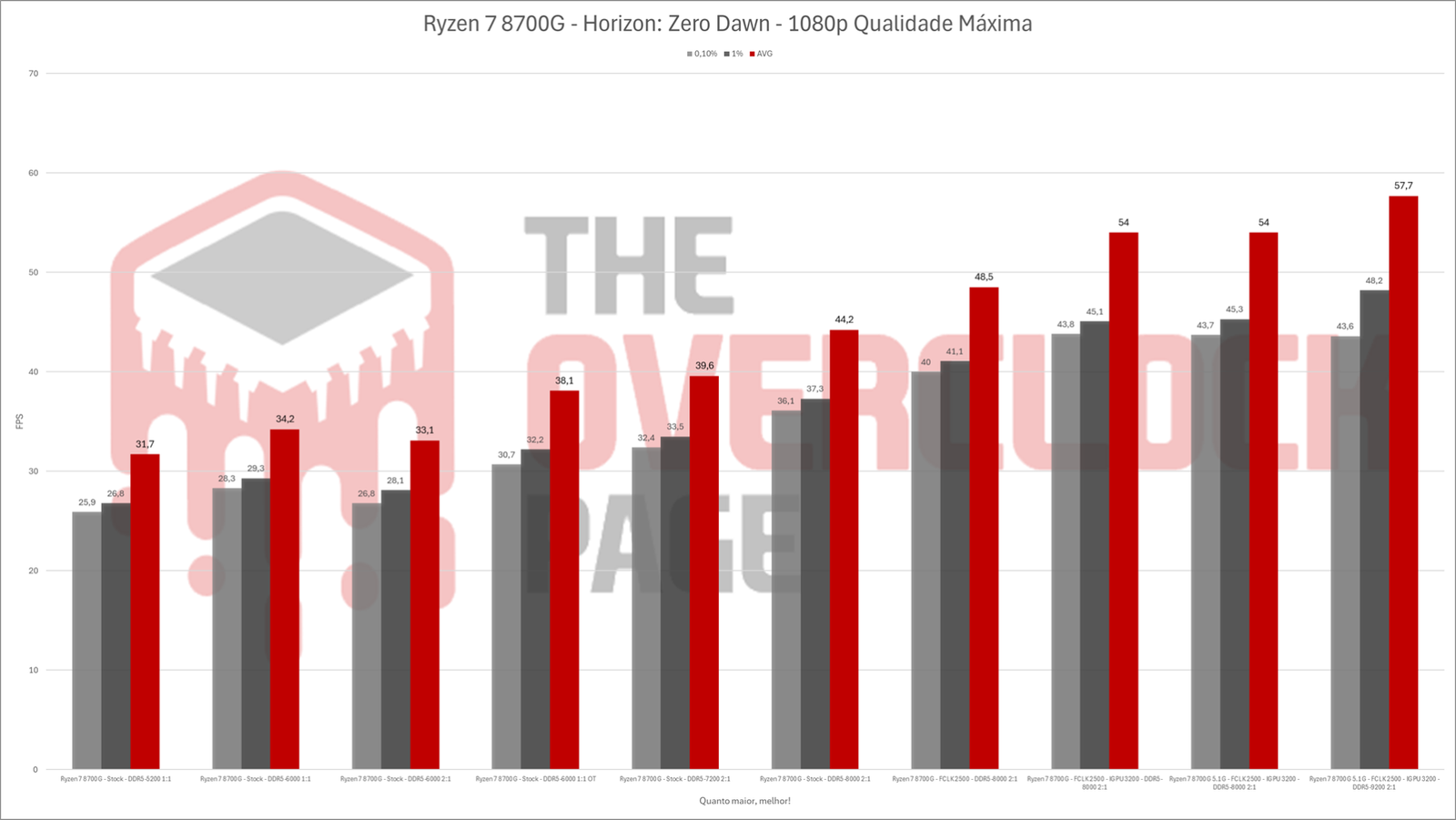 Ao manter as memórias nos mesmos 8000 MT/s, só que com FCLK de 2500 MHz, em relação a configuração nas especificações de DDR5-5200, foram observados ganhos na casa dos 50% no SOTTR, 3DMark Time Spy e Horizon: Zero Dawn, com o Starfield mantendo os mesmos 40% do FCLK padrão.