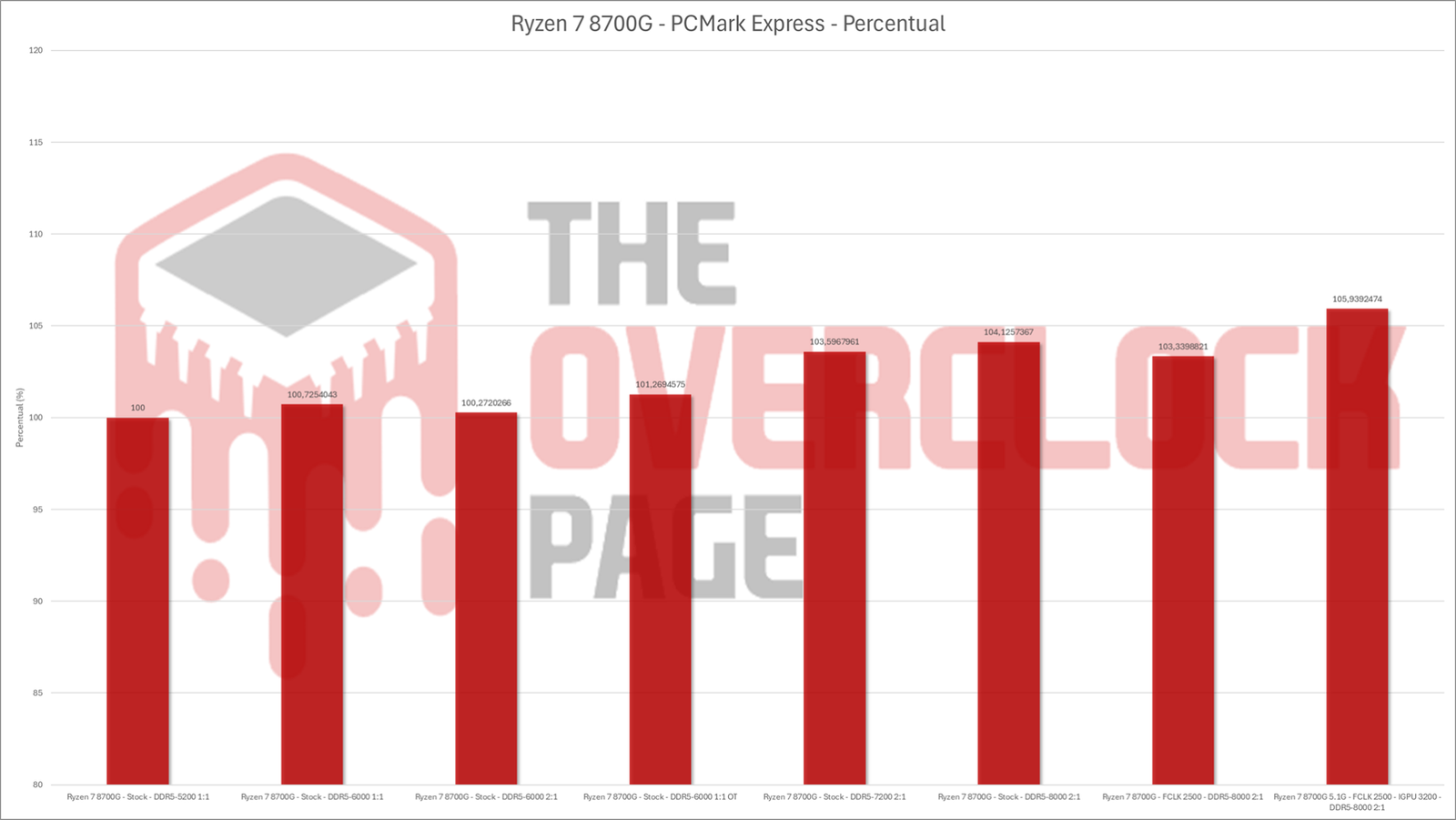 Já nos benchmarks 2D, houve uma tímida melhora em relação aos DDR5-8000 com FCLK padrão, contudo, ainda dentro dos 5% em relação ao padrão de fábrica.