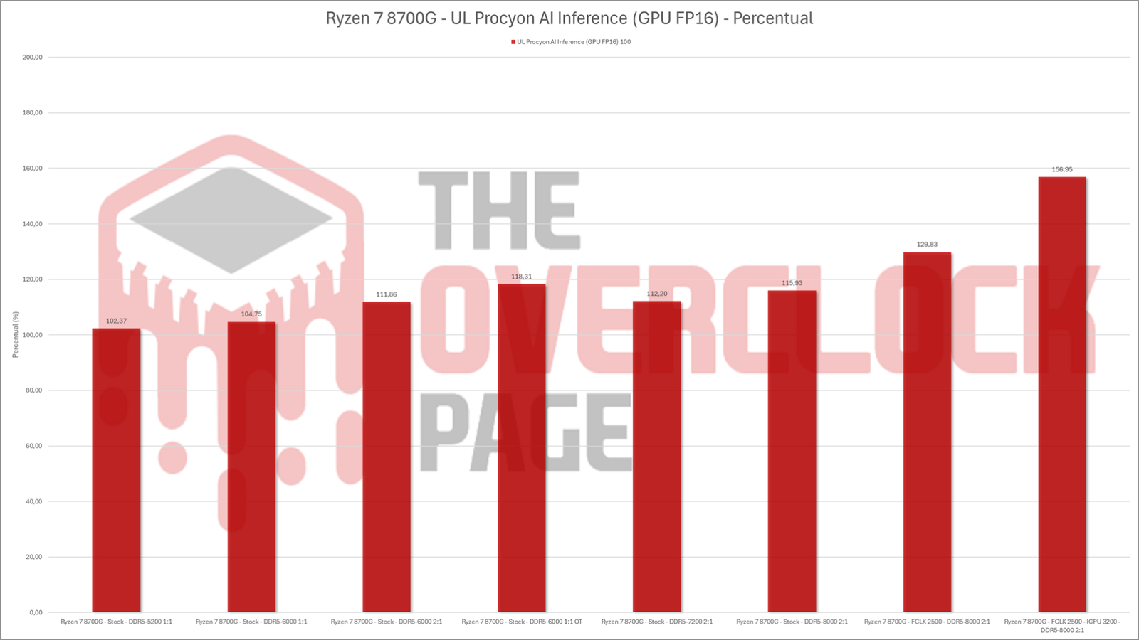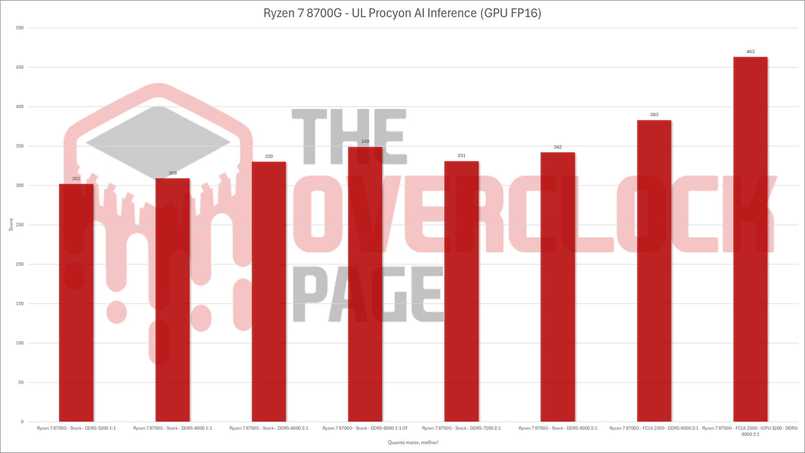 No nosso exemplar de Ryzen 7 8700G, foi possível atingir 3.2 GHz com 1.25V no vídeo integrado, o que junto a memórias DDR5-8000 e FCLK 2500 resultou em ganhos que foram dos 54 aos 70% em relação ao padrão de fábrica! Em outras palavras, o equivalente a um belo de um salto geracional apenas com overclock!