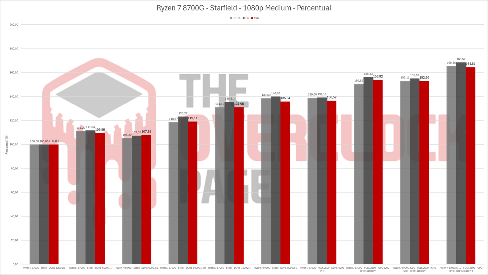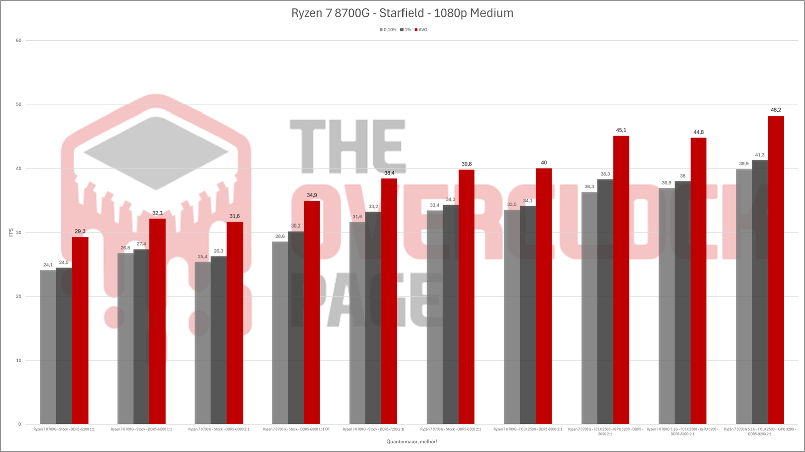 Subir o FCLK para 2500 MHz mantendo os mesmos 8000 MT/s nas memórias, novamente, foi benéfico para a maioria dos jogos, que já acumulam um ganho de quase 50% em relação as especificações padrão, entretanto, é importante destacar que não foram todos os títulos que se beneficiaram, com o Starfield não apresentando ganhos.