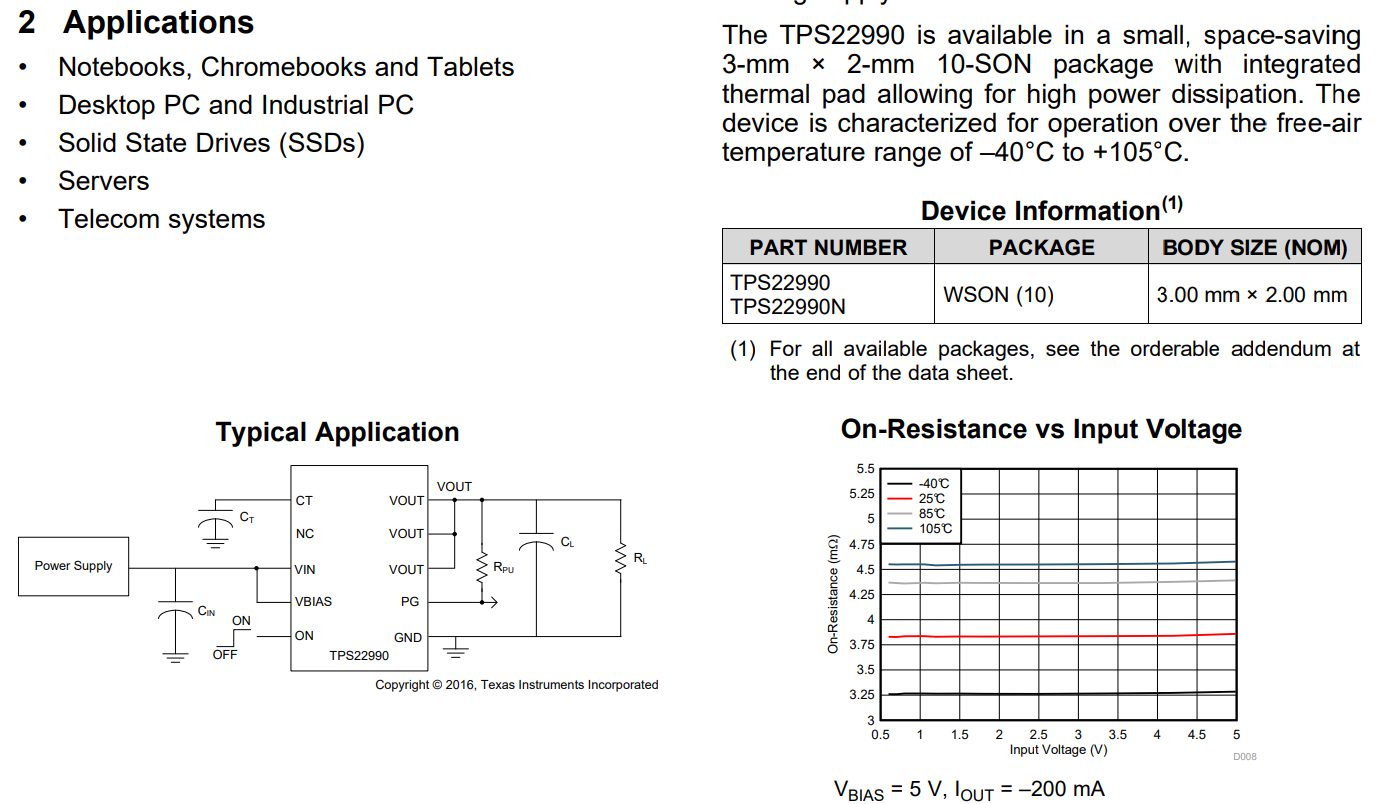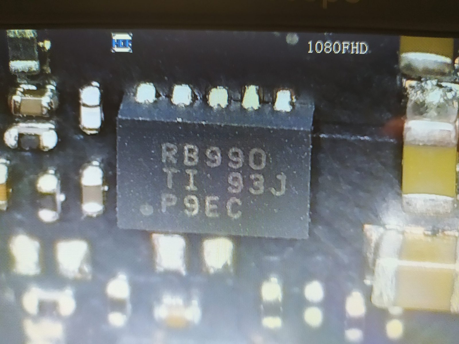 Este outro componente da imagem da esquerda trata-se de um Load Switch da fabricante Texas Instruments, ele tem marcações “RB990 TI“. Porém trata-se do modelo TPS22990 da Texas Instruments cujo é um Load Switch que trabalha com até 5.5V conseguindo fornecer até 10A de corrente contínua e possui uma resistência de 3.9m?.
