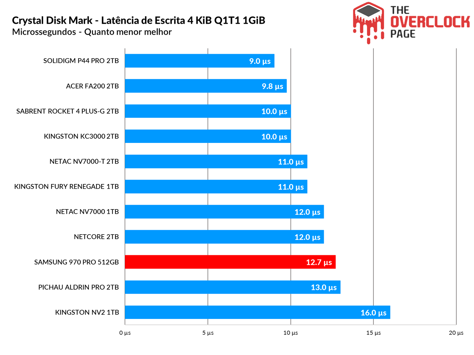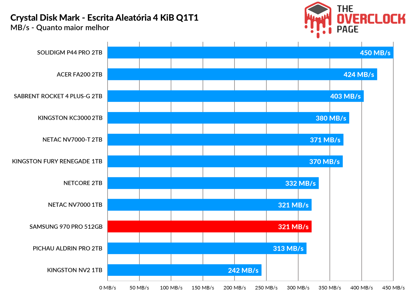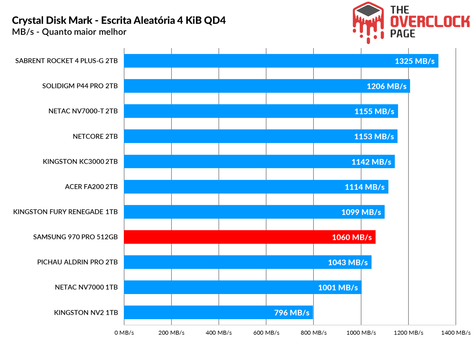 Neste benchmark, com um foco um pouco maior na escrita, ele ficou levemente inferior ao NV2 devido ao seu esquema de SLC Cache, com uma largura de banda maior e latência menor que este SSD Samsung, isto ocorre pois este Samsung não usa SLC Cache.