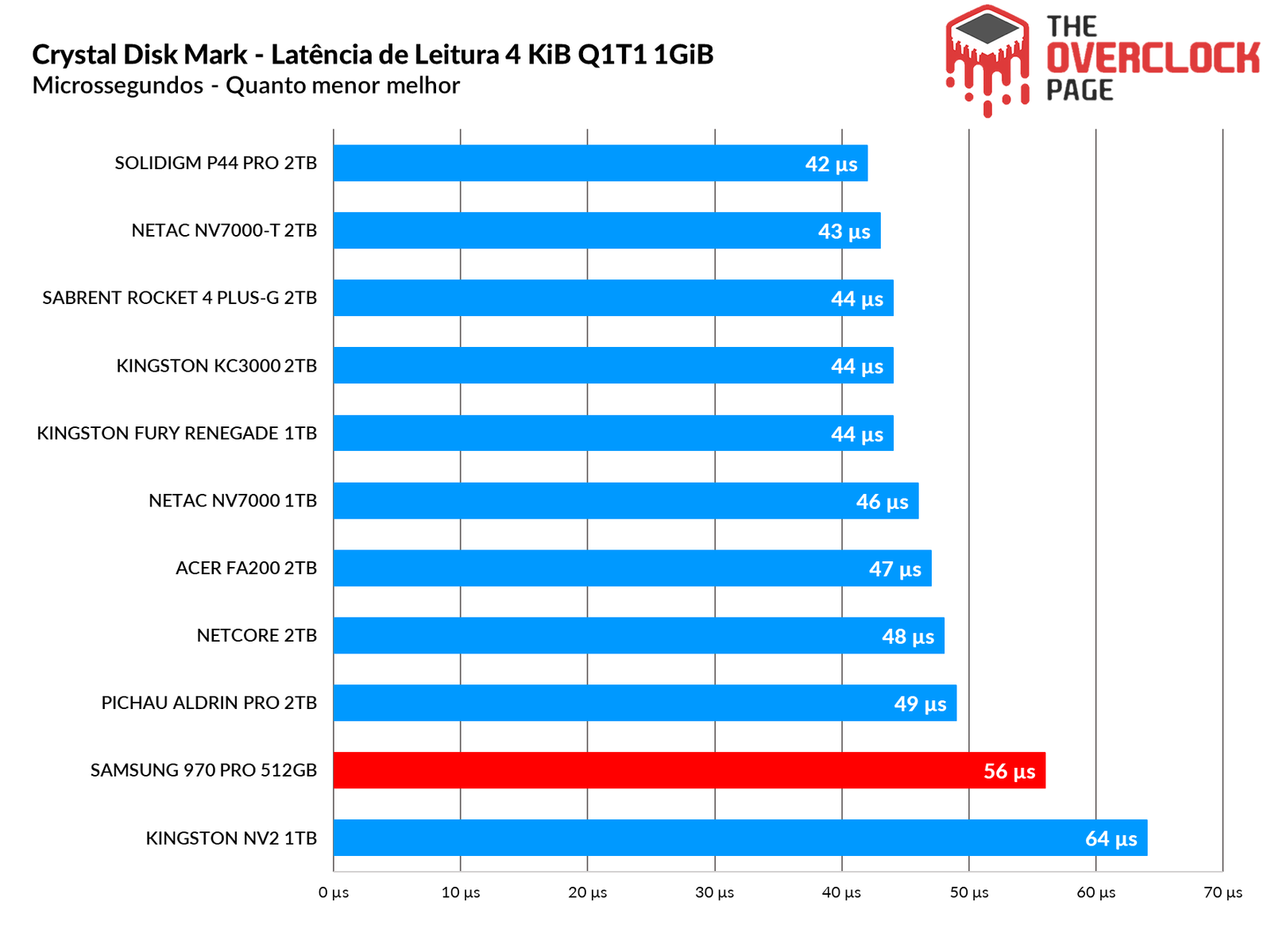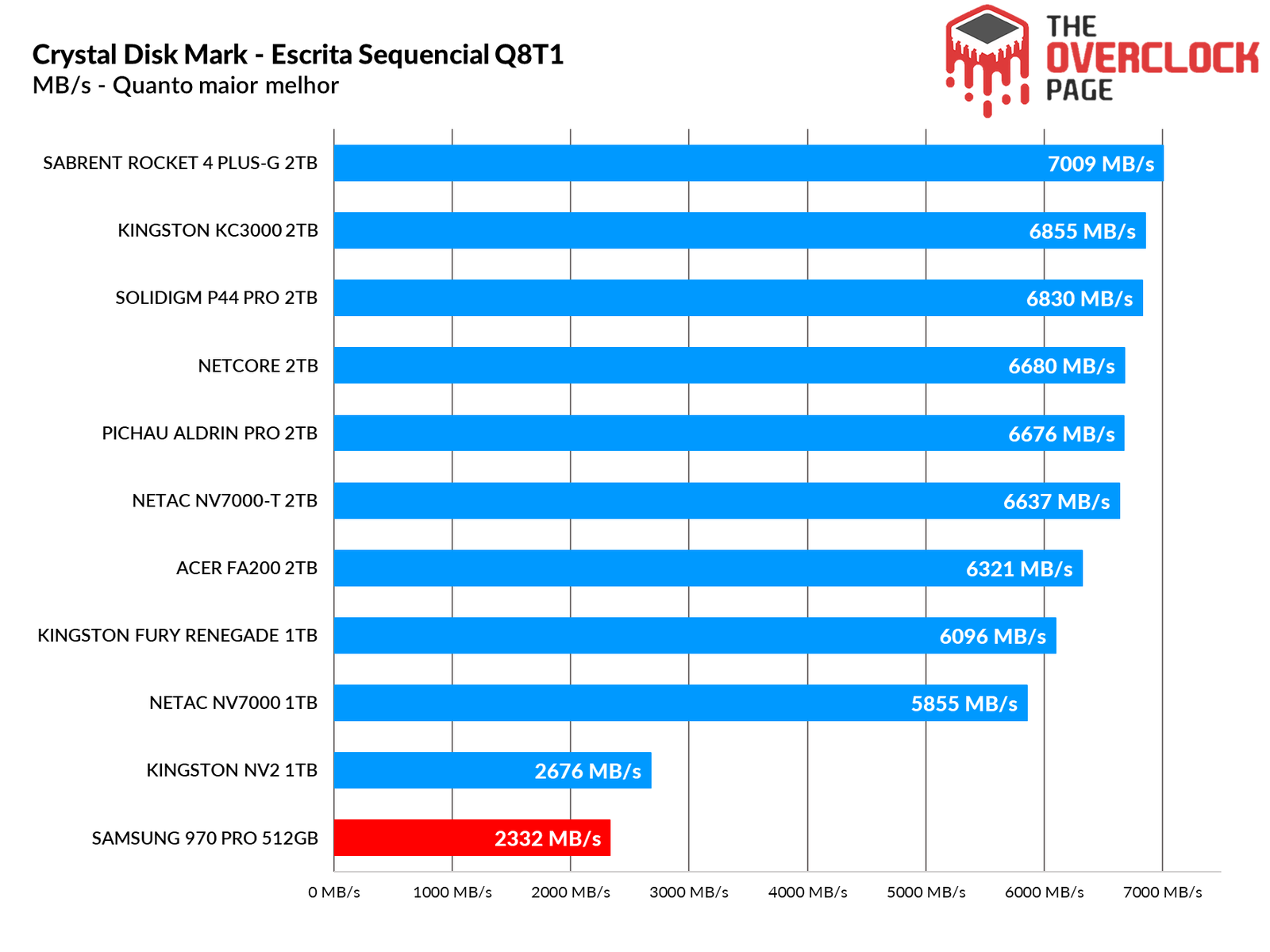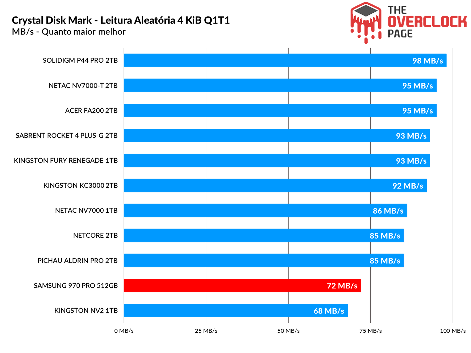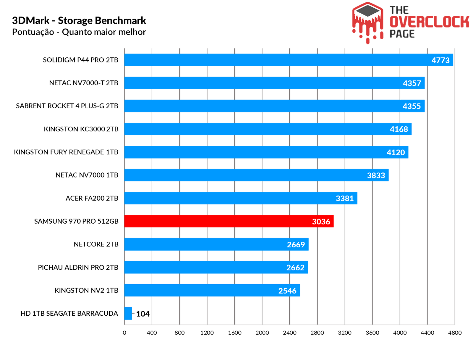 Neste benchmark, com um foco um pouco maior na escrita, ele ficou levemente inferior ao NV2 devido ao seu esquema de SLC Cache, com uma largura de banda maior e latência menor que este SSD Samsung, isto ocorre pois este Samsung não usa SLC Cache.