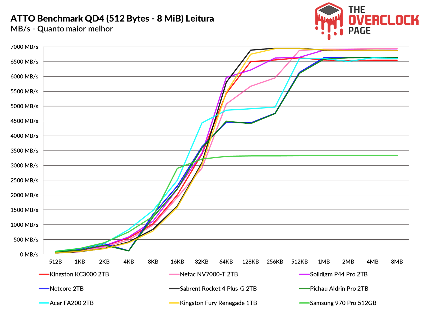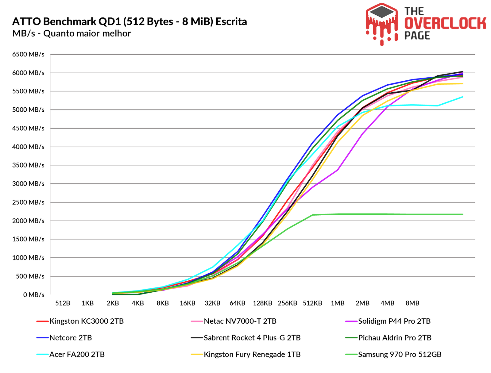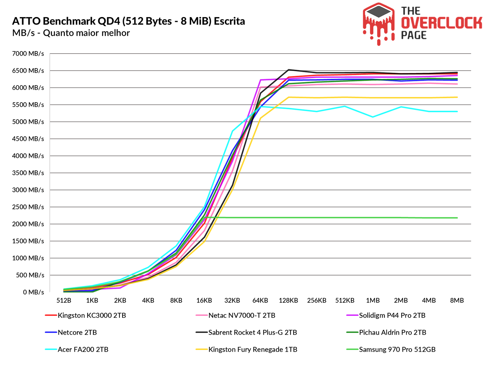 O ATTO Disk Benchmark é um software que faz um teste de velocidade sequencial com arquivos comprimidos, ou seja, para uma simulação em uma carga de transferência de dados como no Windows, geralmente vemos algo em torno dos blocos de 128KB à 1 MiB, agora, em sua leitura, em blocos pequenos ele foi um dos SSDs com melhores desempenhos, ele acaba ficando para trás a partir de 16KB devido ao seu barramento PCIe 3.0.