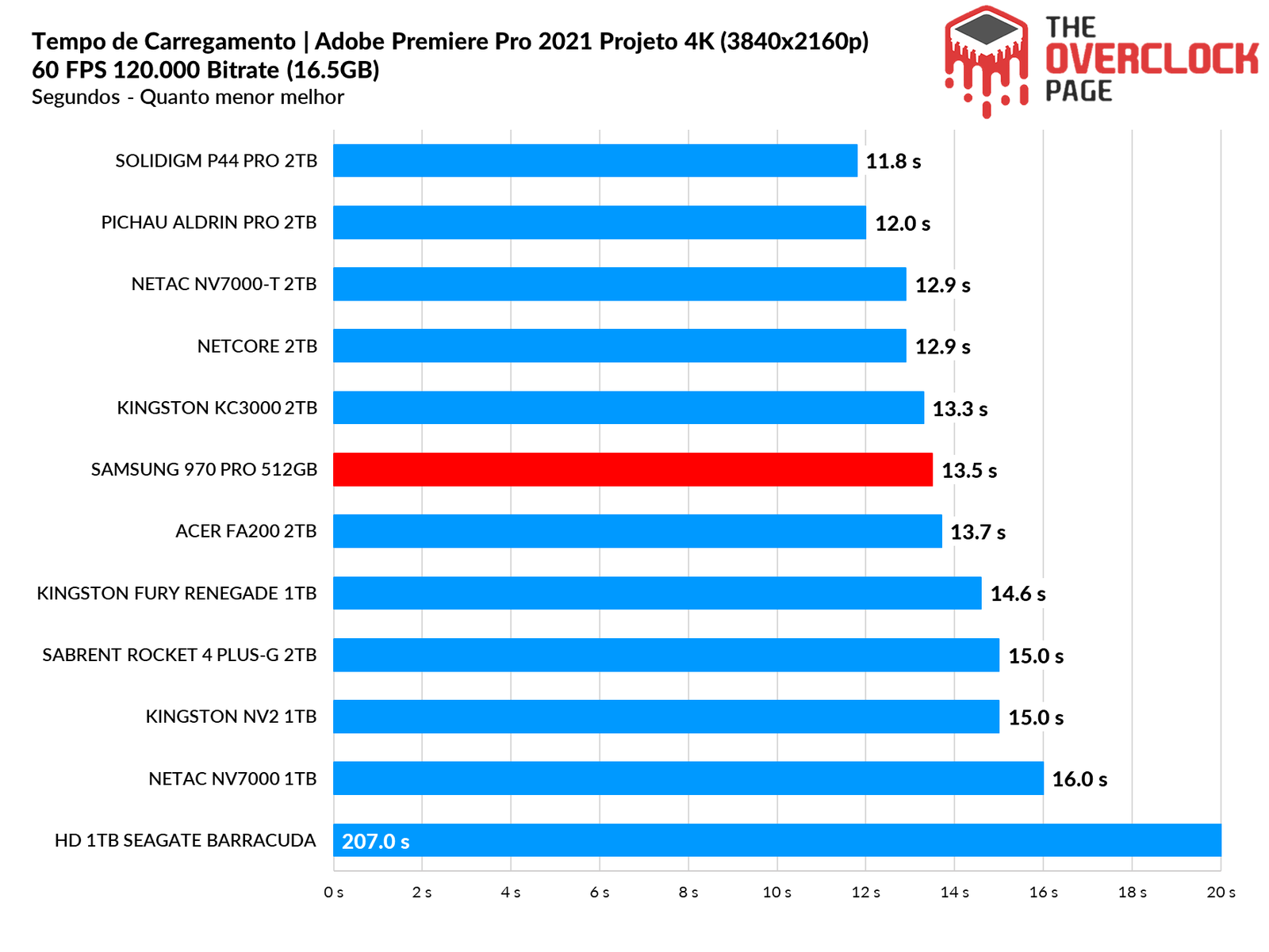 No carregamento deste projeto no Premiere foi possível observar um empate técnico entre este Samsung e o SSD Acer FA200 que testamos recentemente, outro ótimo resultado para o Samsung.
