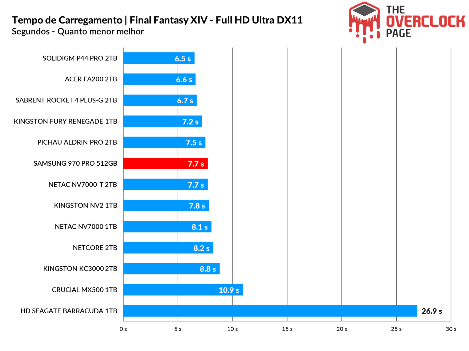 Aqui temos uma comparação entre múltiplos SSDs e um HD, utilizando uma instalação limpa do Windows 10 Build 21H1 junto do benchmark do Final Fantasy XIV abrindo o modo campanha. O teste consiste no melhor resultado após três boots seguidos do sistema, considerando o tempo total até finalizar na área de trabalho com o score informado pelo aplicativo, por isso, é mais lento do que o boot até mostrar a tela da área de trabalho.