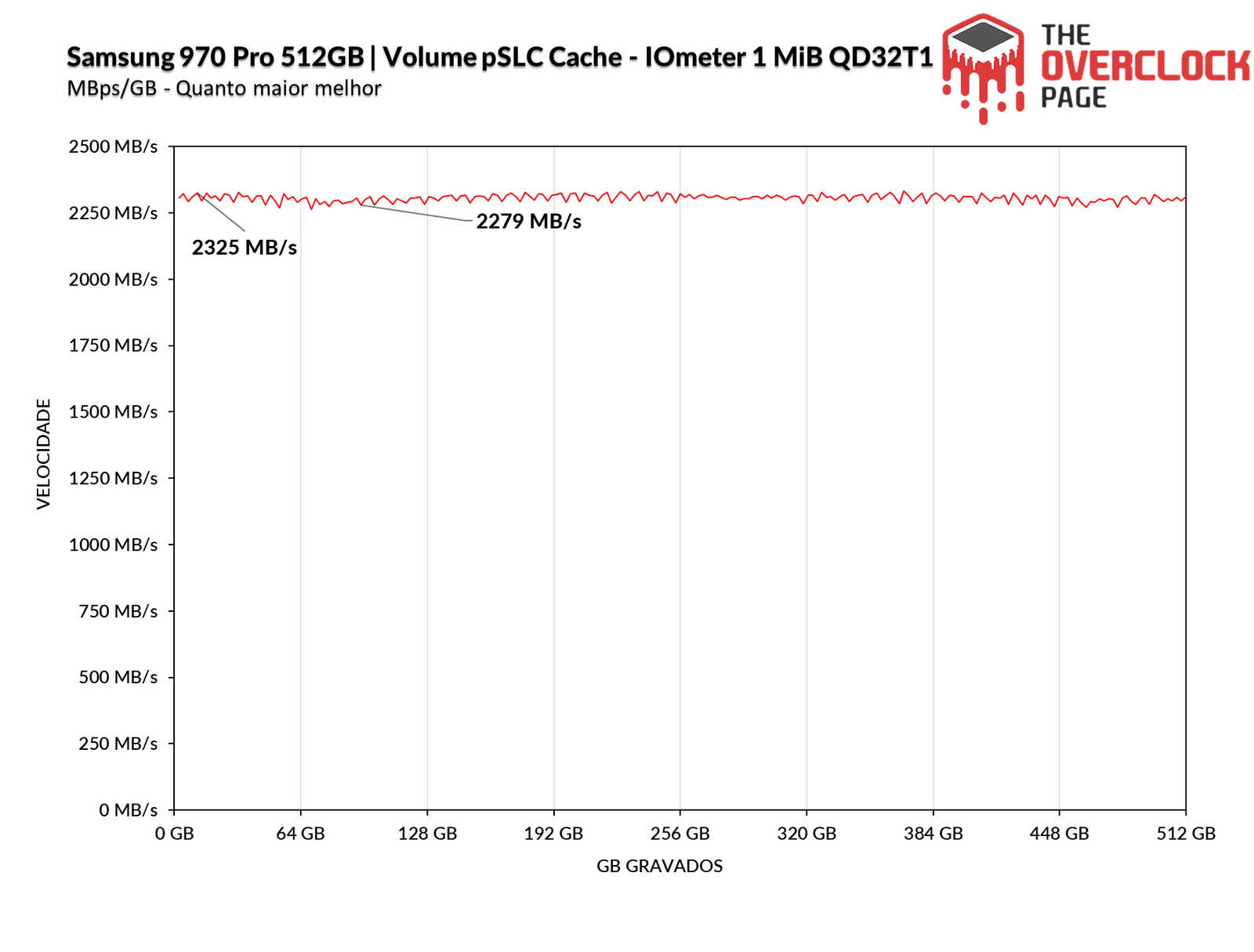 Através do IOmeter, podemos ter uma ideia do volume de SLC cache deste SSD, já que o fabricante muita vezes não informa este valor, entretanto, este SSD não utiliza SLC Cache, não pelo fato que a fabricante não quer mais desempenho, mas pelo simples fato de que esses Dies MLC sem esta técnica de SLC Caching já conseguem fornecer um desempenho capaz de saturar o barramento PCIe 3.0.