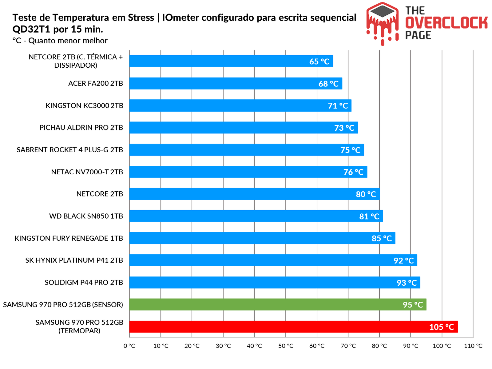 Realmente este SSD é quente…. Notamos que no seu sensor ele apresenta uma temperatura de mais de 95ºC, embora ao medirmos com um termopar, foi possível perceber que o IHS do seu controlador estava acima de 105ºC.