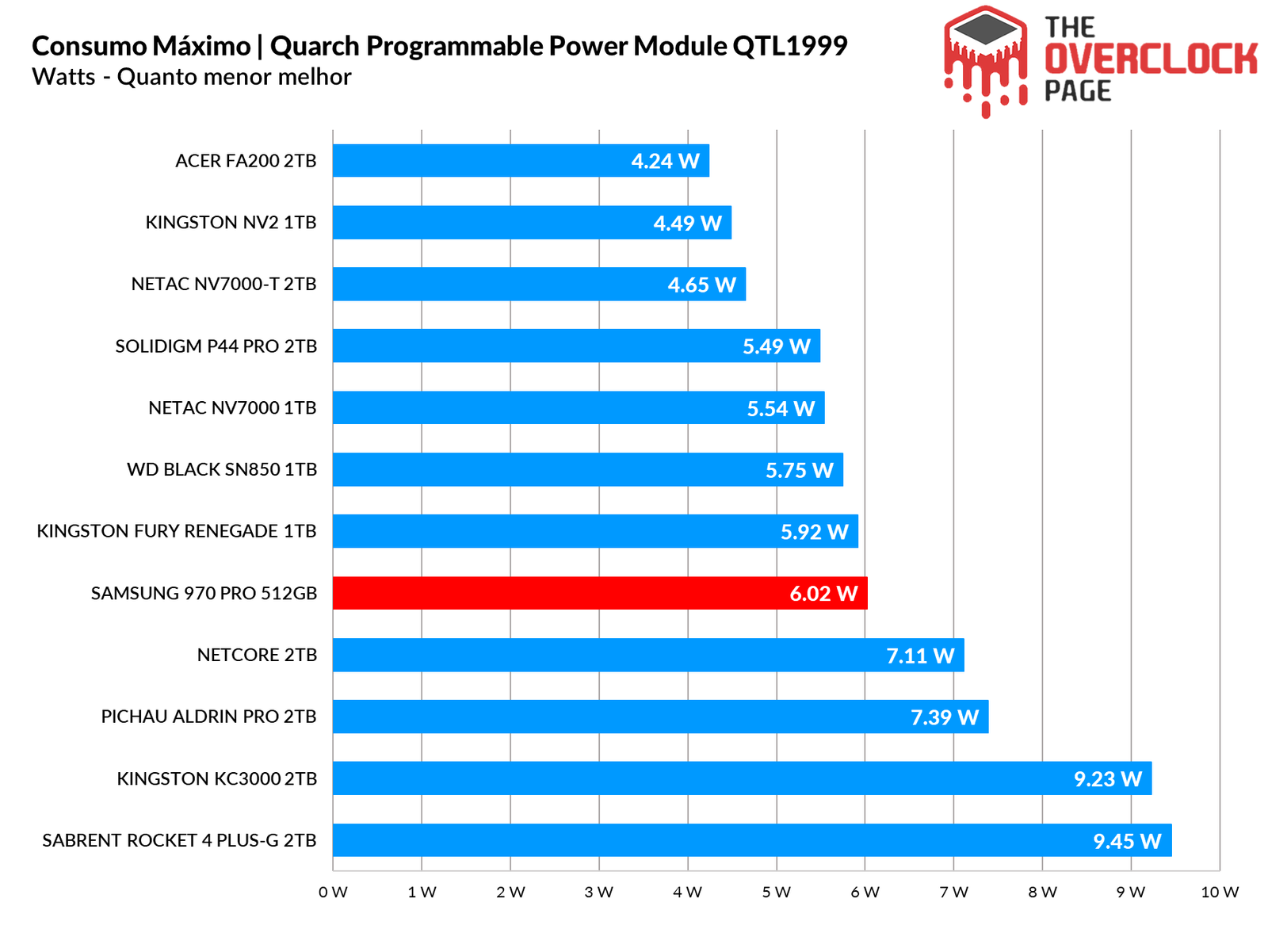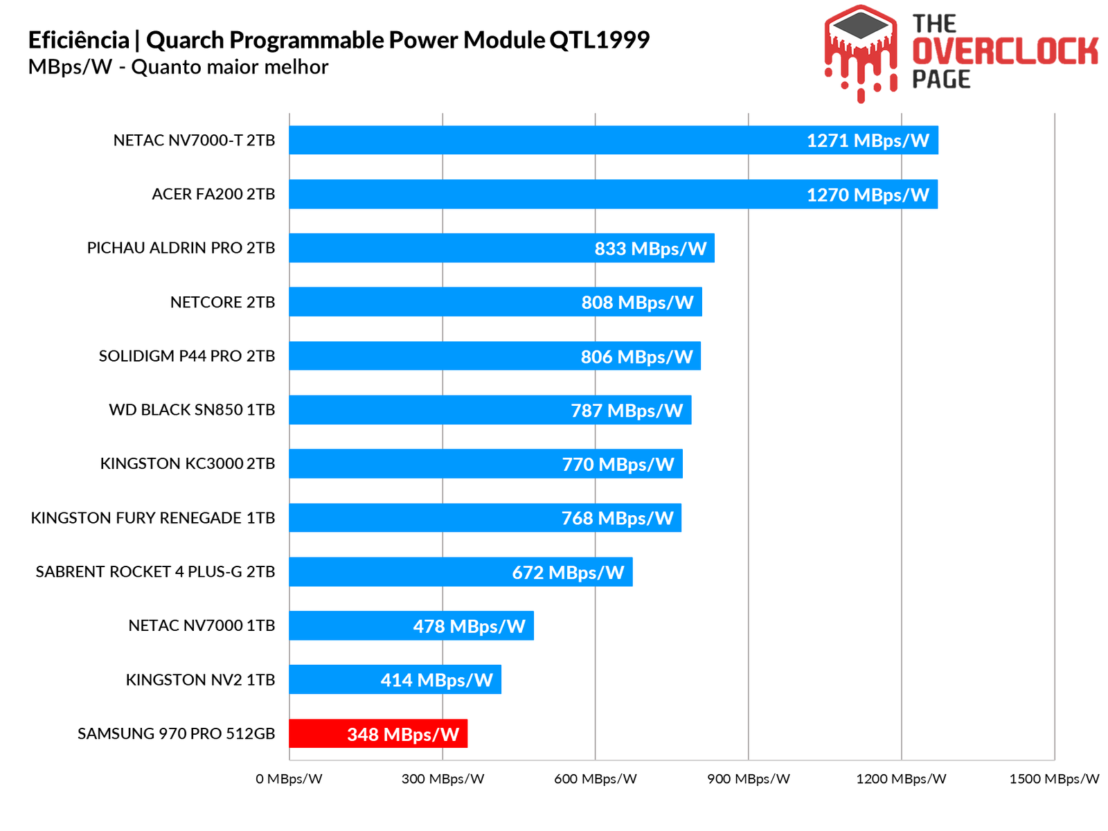 Sua eficiência acabou ficando bem reduzida ao comparamos com SSDs Gen4. Isso ocorre devido ao fato de que os SSDs Gen4 tem uma largura de banda bem mais elevada, enquanto o Samsung teve um consumo médio na faixa dos 5.3W o que para um SSD Gen3 pode ser considerado elevado, já que existem SSDs mais eficiêntes com controladores de 4 canais como o MAP1602.