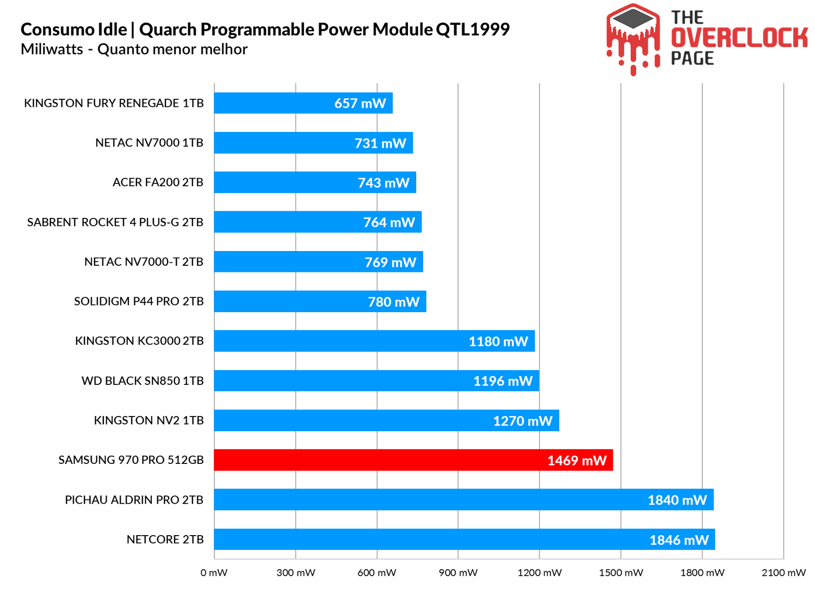 Por último e mais importante, teste em Idle, sendo o cenário em que a esmagadora maioria dos SSDs se encontram no uso do dia a dia ou cotidiano, constatamos que mesmo aqui ele ainda tem um consumo elevado, ficando em quase 1500mW.