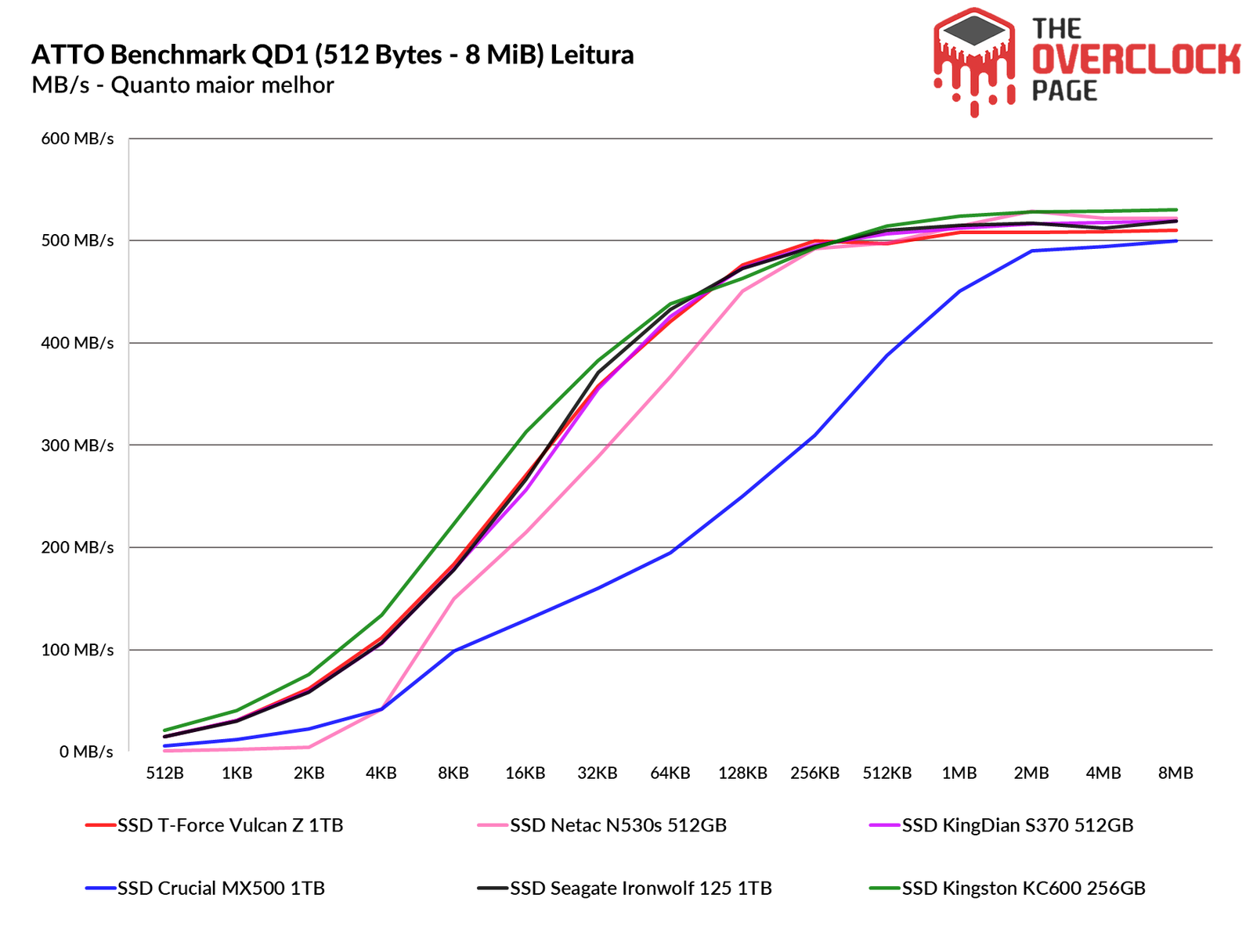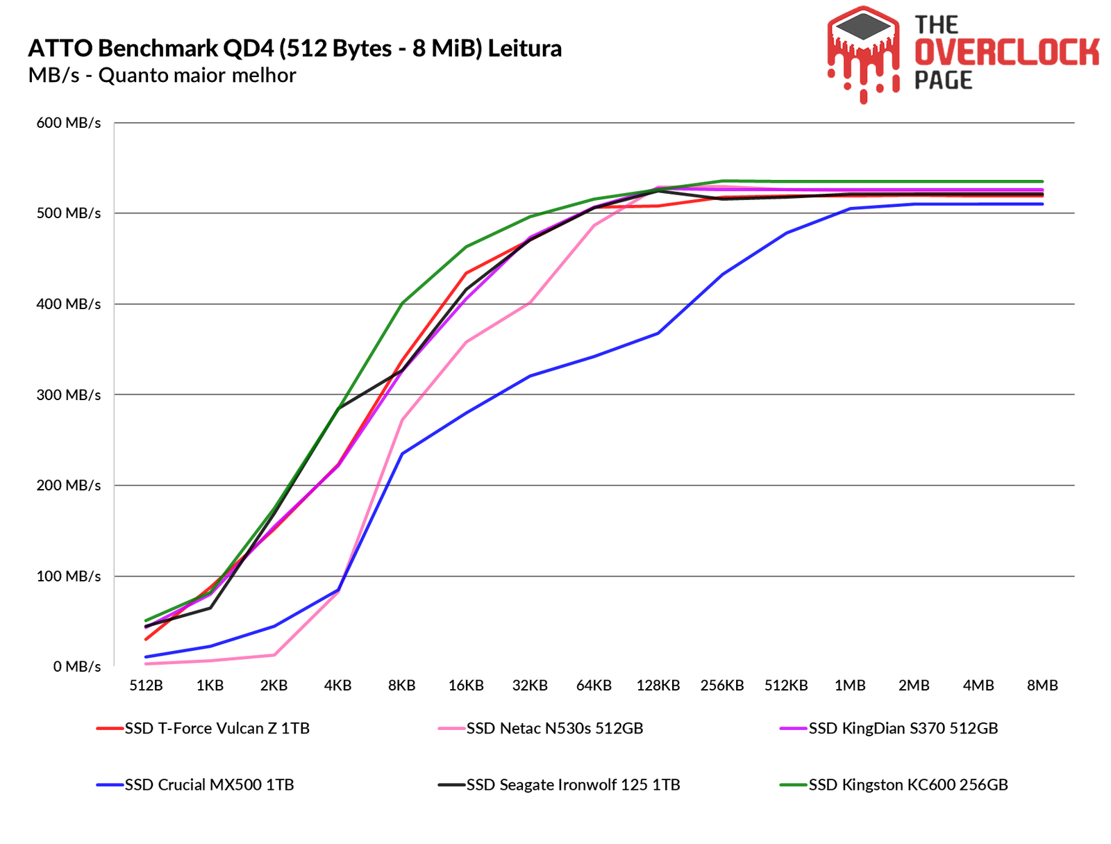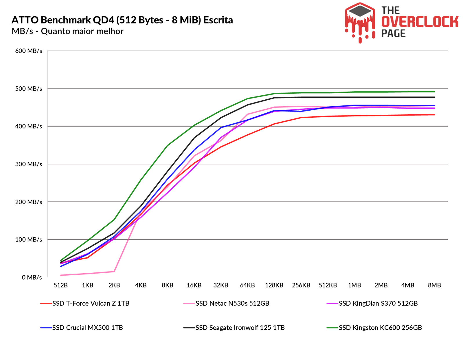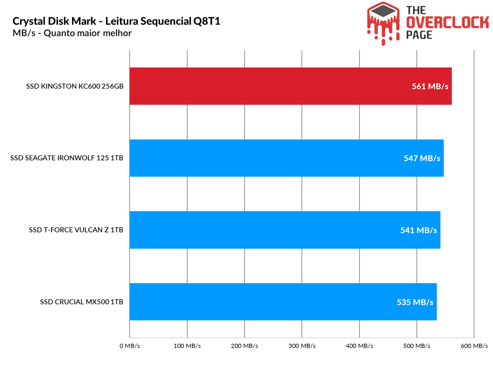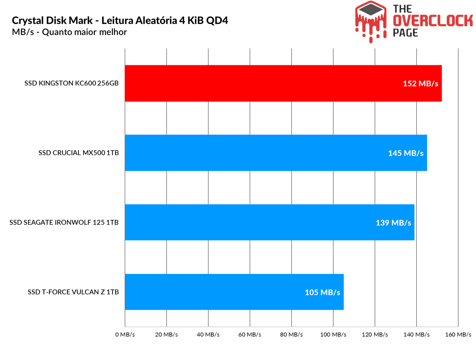 Ao compararmos as velocidades sequenciais destes SSDs SATA vemos que não há uma diferença muito grande, entretanto, o KC600 consegue ficar levemente à frente dos demais SSDs do comparativo.