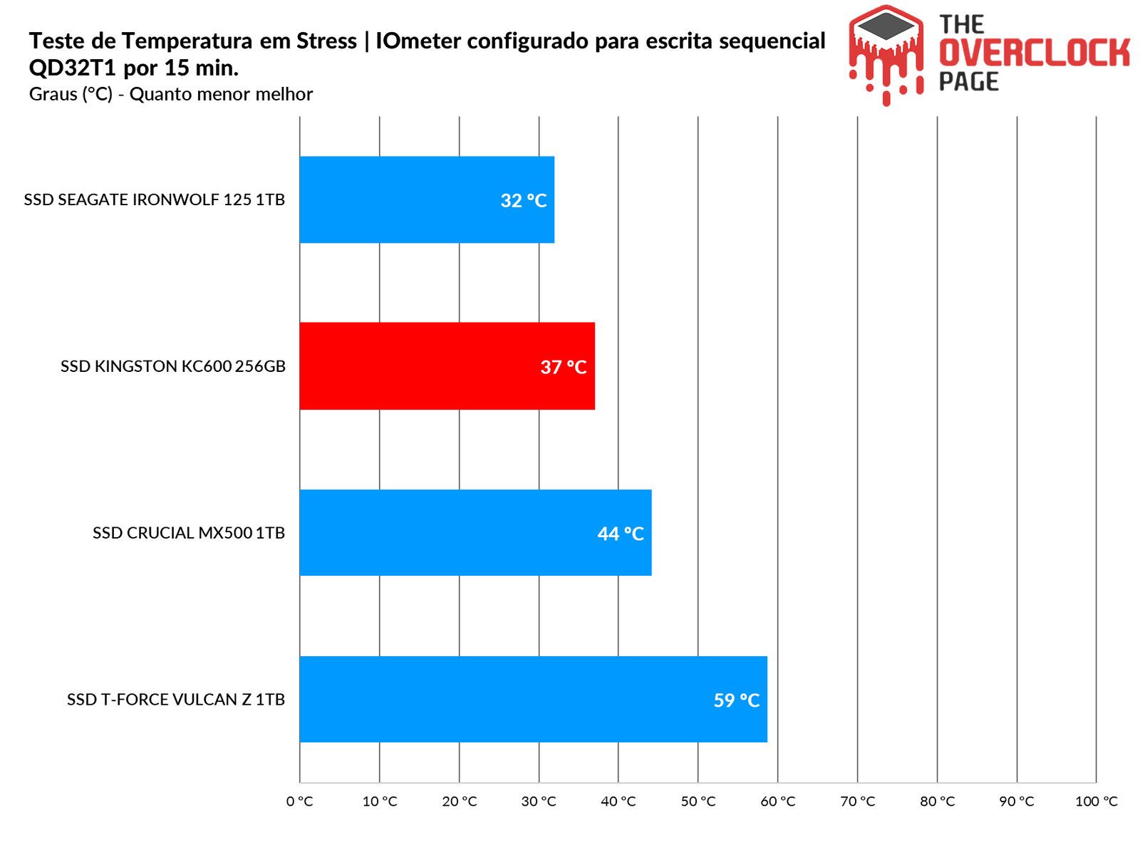 Sua temperatura máxima foi de 37ºC o que foi bem abaixo do limite configurado pelo fabricante e devido a este resultado, o SSD não sofre com thermal throttling.