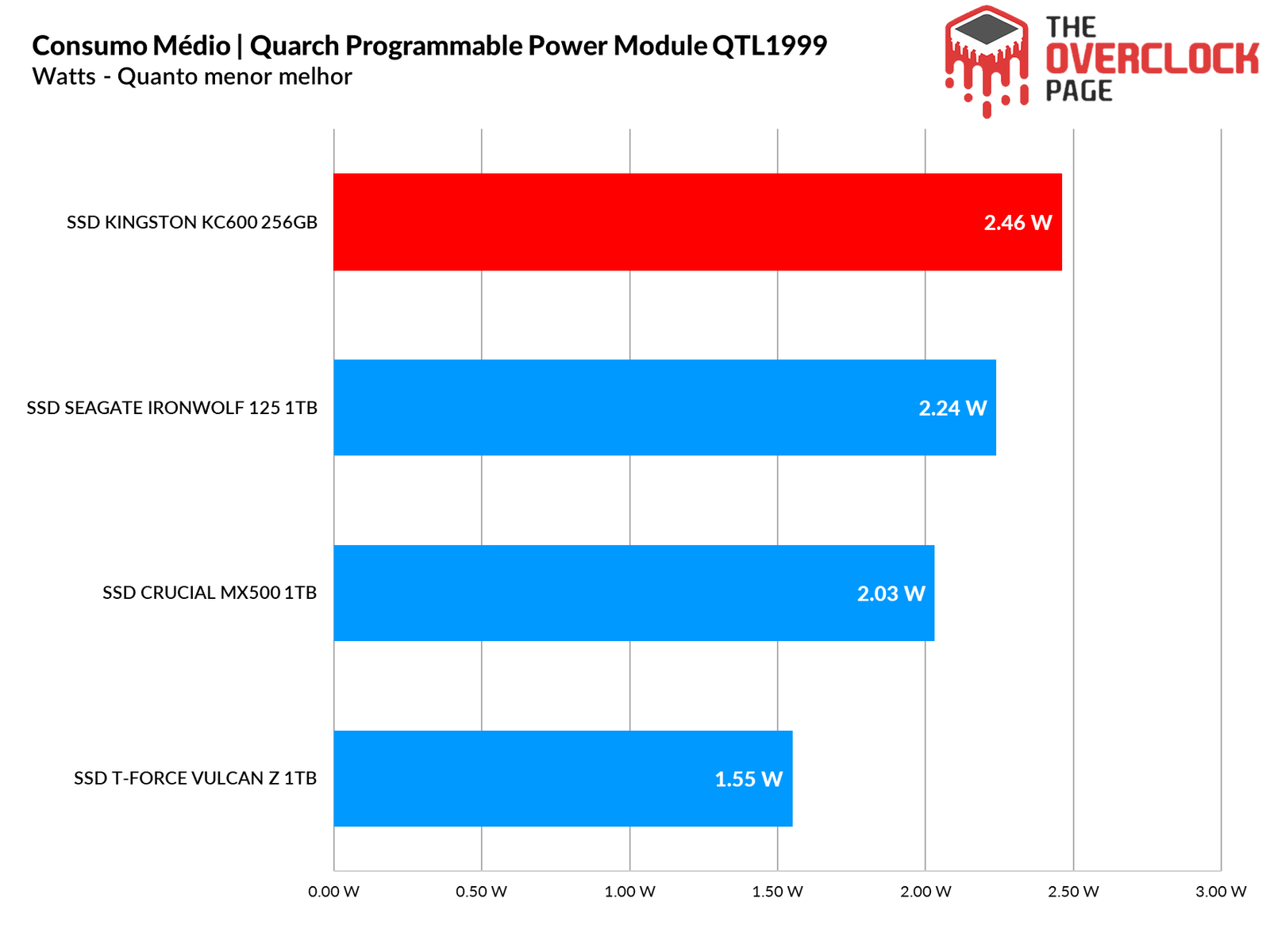 Durante nosso benchmark, dentre todos os SSDs SATA que comparamos este foi o que teve o maior consumo elétrico, ficando acima até do SSD da Seagate, isso que foi um SSD de 1TB.