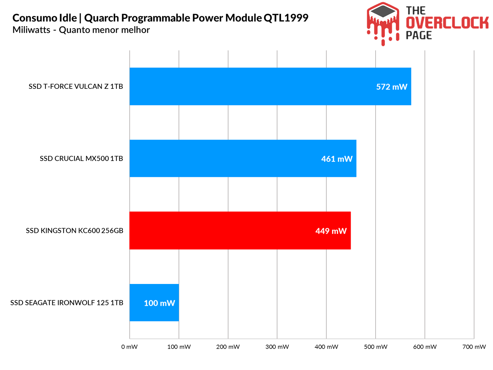 Por último e mais importante, teste em Idle, sendo o cenário em que a esmagadora maioria dos SSDs se encontram no uso do dia a dia ou cotidiano, o que ao menos em Idle ele obteve um bom resultado, ficando a frente dos demais SSDs, perdendo apenas para o Seagate Ironwolf.