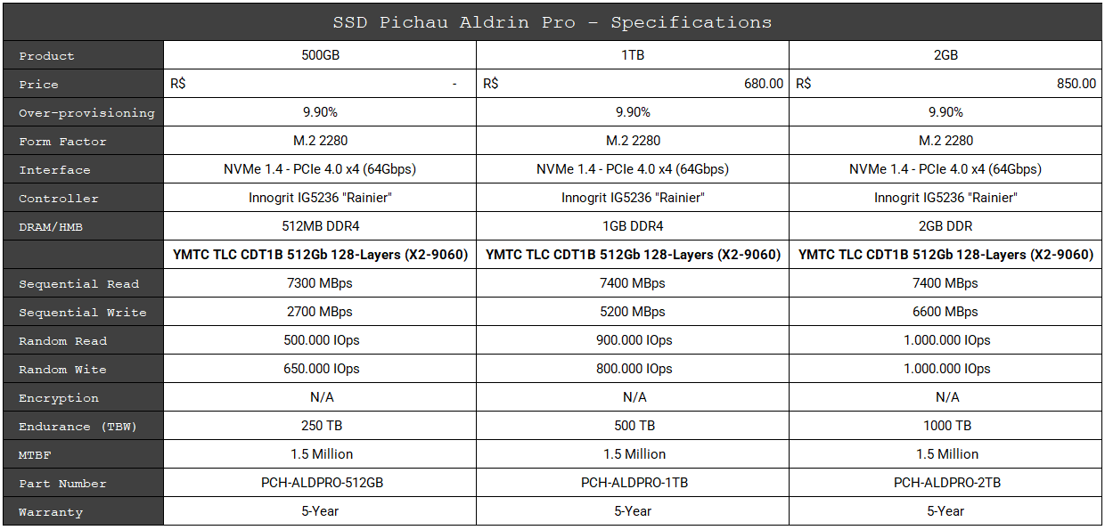 The chosen SSD was a Pichau Aldrin Pro 2TB, which we tested a few months ago. It was provided by Pichau for a review and now for this article.