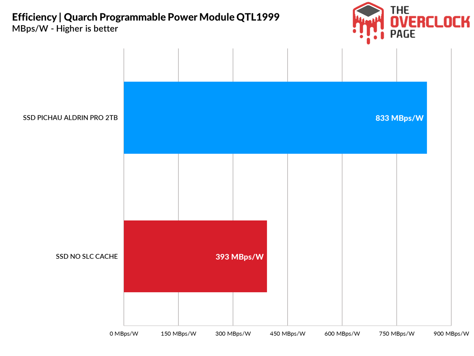 In terms of efficiency, there was a significant drop, even though the power consumption decreased. This happens because, although the bandwidth decreased, the power consumption also dropped. When the SLC Cache was active, the SSD’s power consumption was close to 5W, but it achieved over 3000 MB/s in bandwidth.