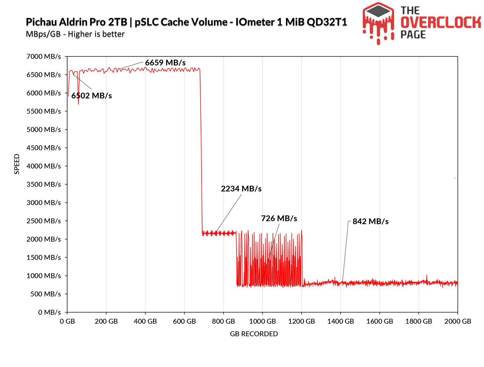 Using IOmeter, we can get an idea of the SLC cache volume of this SSD, as the manufacturer often does not disclose this information. From the tests we conducted, it was evident that it has a dynamic pSLC Cache of approximately 691GB, which is quite large. It managed to maintain an average speed of around 6579MB/s until the buffer was exhausted, which is a good speed considering this is a 2TB PCIe 4.0 SSD with 32 dies.