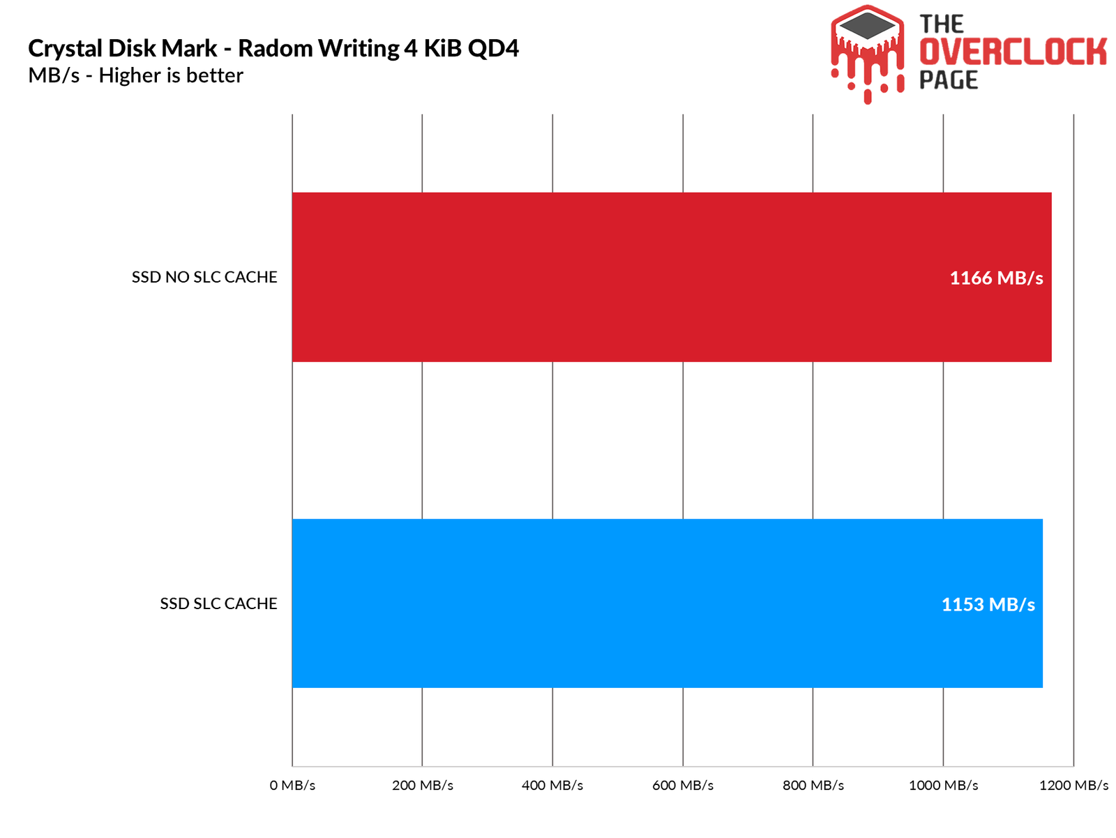 In random scenarios like this, the pSLC Cache significantly improved read performance. However, for writing, since it operates on the NANDs’ native capacity, there wasn’t a noticeable difference in performance, as the SSD can easily deliver over 1GB/s in write speed.