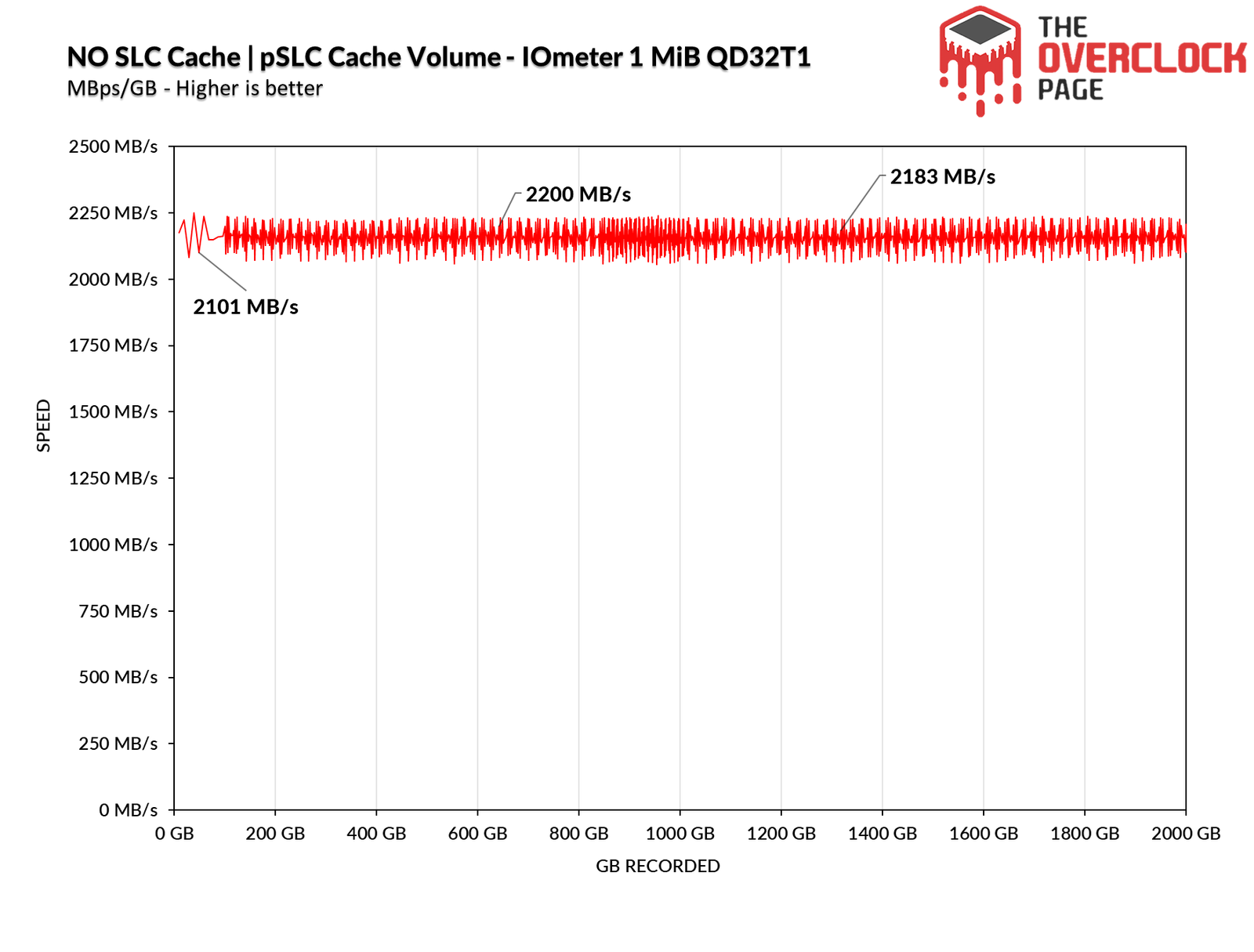 However, a significant advantage of disabling the pSLC Cache is the consistency in performance. In this case, the SSD maintains a steady and stable speed above 2100 MB/s from the beginning to the end of the test, and it doesn’t drop below this level unless it’s experiencing thermal throttling.