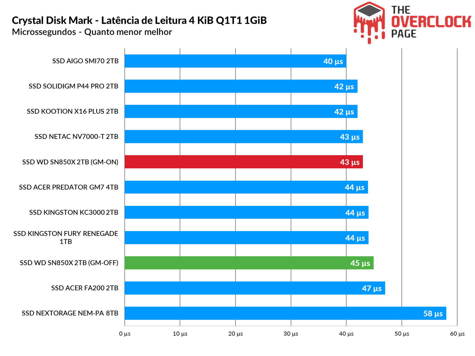 Em suas latências, na leitura tivemos uma diferença mais significativa com o game mode ativado e desativado, mas na escrita a diferença foi imperceptível.