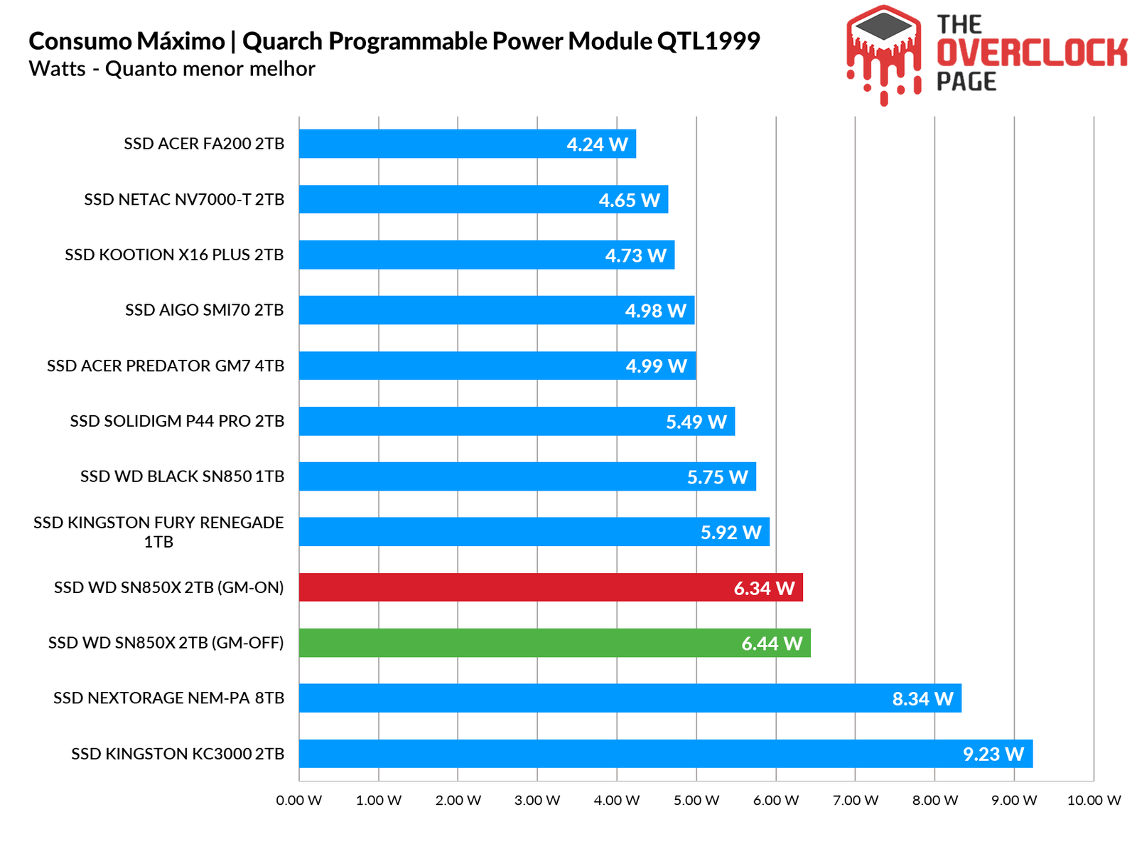 Já não era esperado que este SSD conseguisse ter um consumo tão baixo quanto SSDs DRAM-Less de 4 canais como os que possuem os Maxiotech Falcon Lite (MAP1602). Entretanto, seu consumo para um SSD de 2TB foi razoalmente adequado e a diferença do Game mode ativado ou desativado foi de apenas 10 mW.