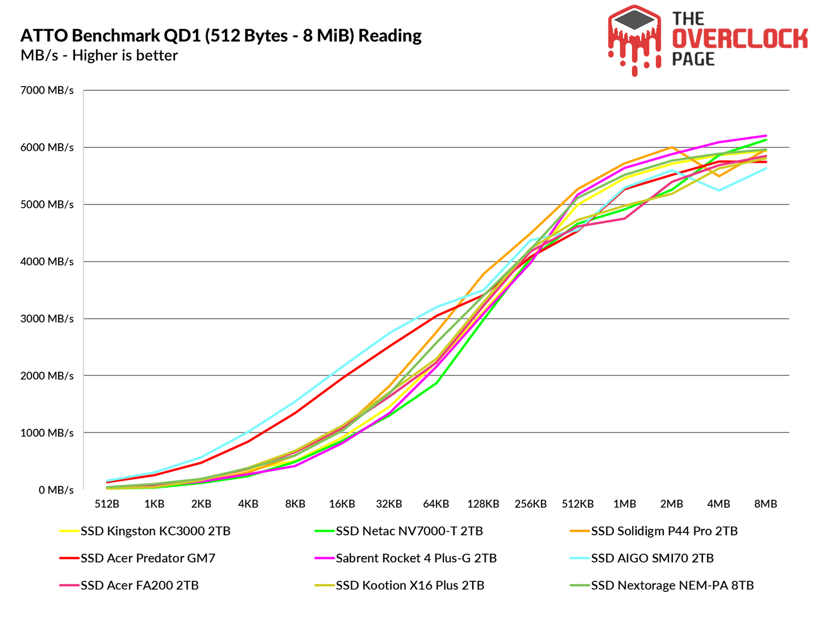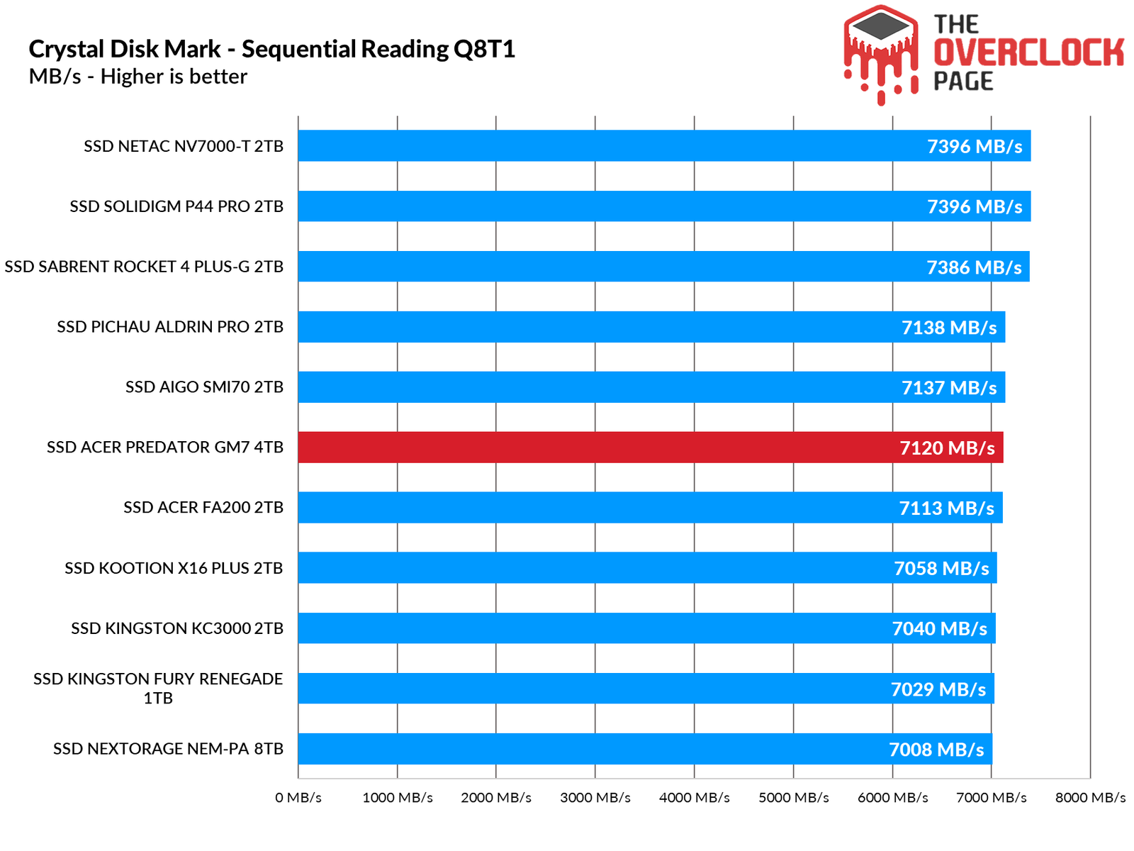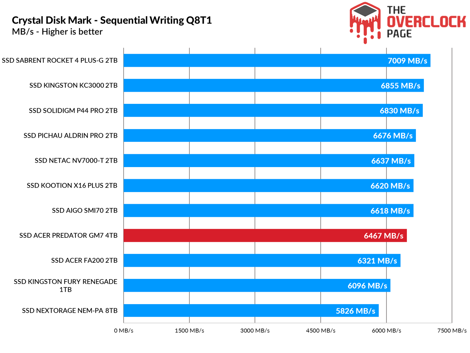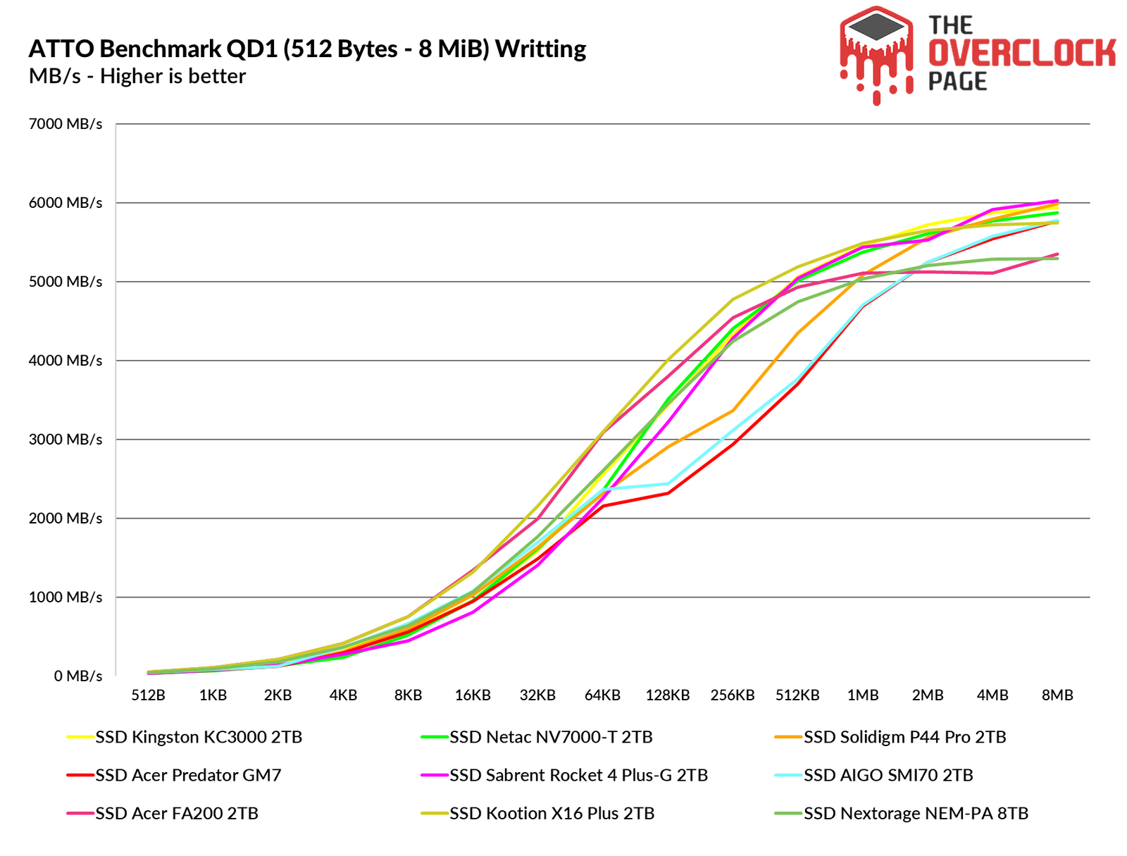 As we’ve seen many times before, sequential speed tests often show no noticeable difference in casual use, only in synthetic benchmarks. In these tests, the GM7 performs on par with other SSDs.
